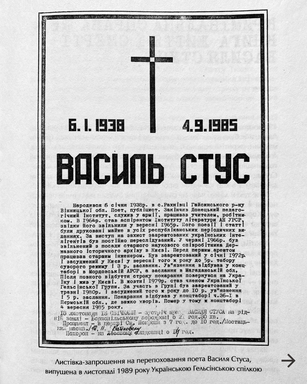 Василь Семенович Стус (6 січня 1938, село Рахнівка, Гайсинський район, Вінницька область — 4 вересня 1985, табір ВС-389/36-1 (Перм-36), біля села Кучино, Пермський край, РРФСР) — український поет-шістдесятник, перекладач, публіцист, прозаїк, мислитель, літературознавець, літературний критик, правозахисник, політв'язень СРСР, дисидент, член Української Гельсінської групи, борець за незалежність України у XX столітті. Учасник акції протесту в київському кінотеатрі «Україна» в 1965 році. Лауреат Державної премії ім. Т. Шевченка (1991, посмертно), Герой України (2005, посмертно).