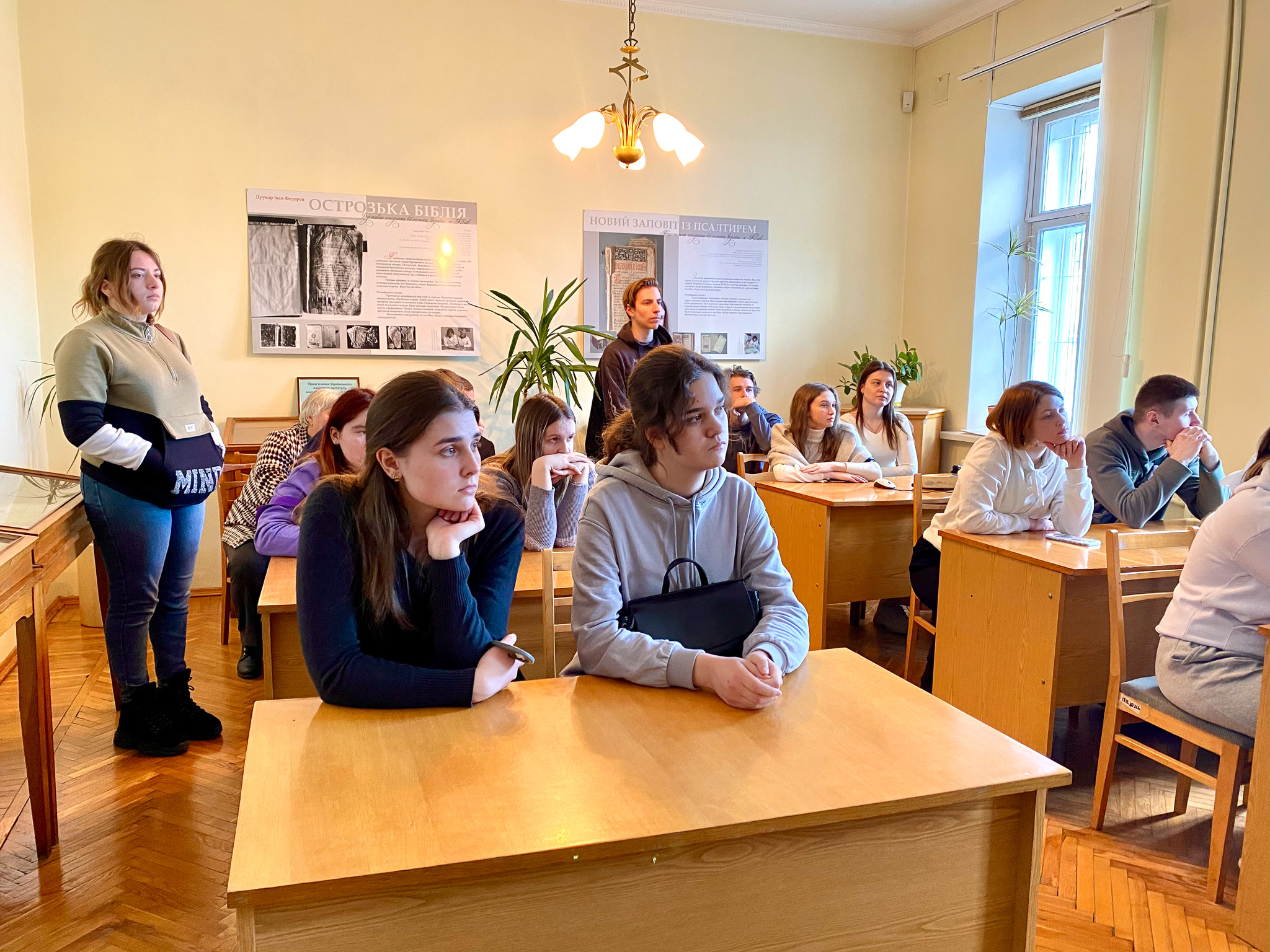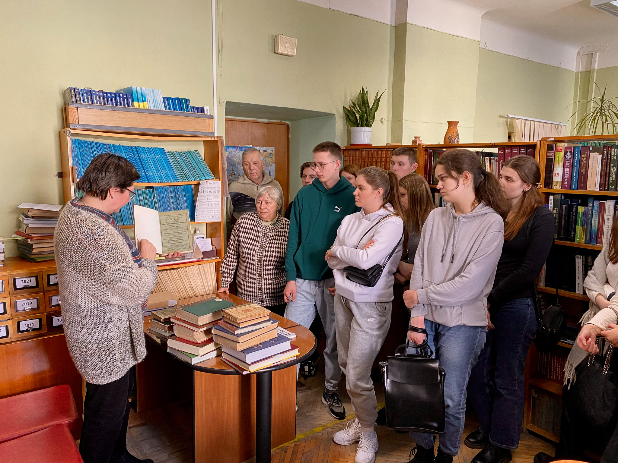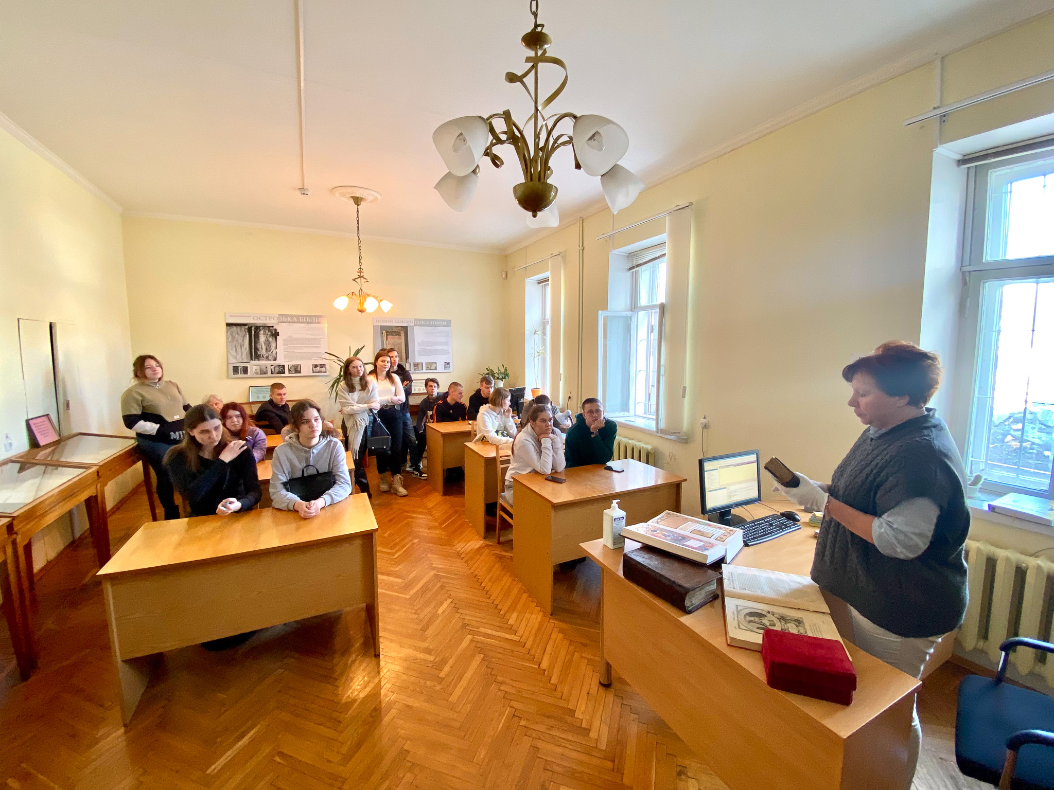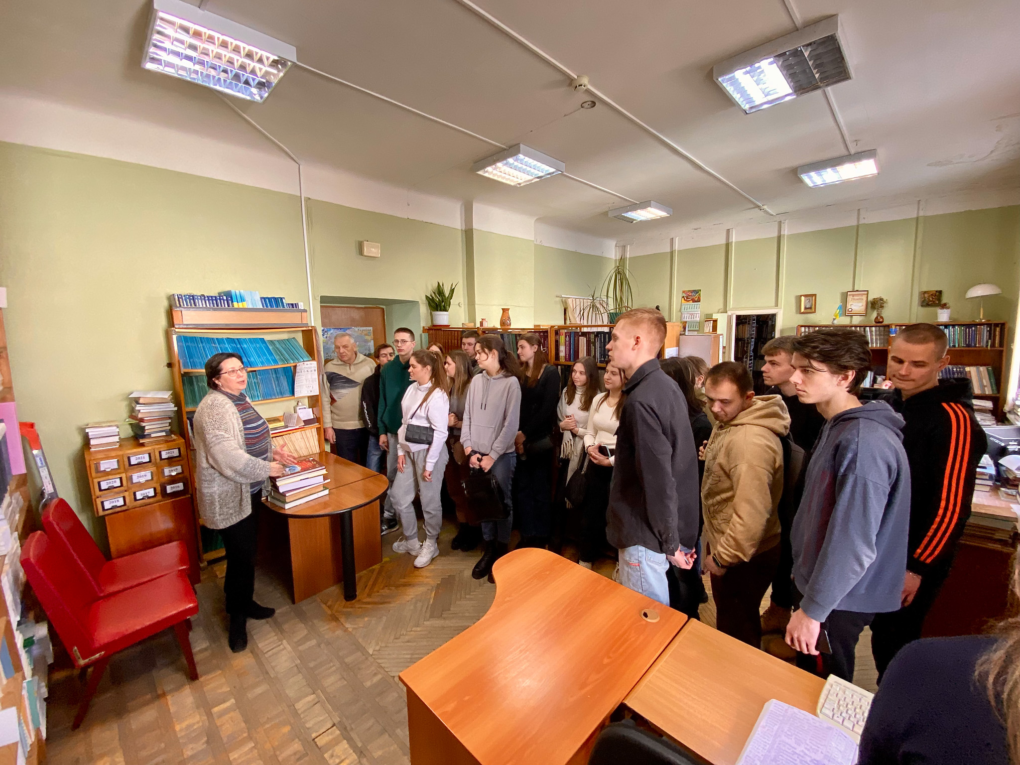 2 березня 2023 року в Національній історичній бібліотеці України була проведена лекція-екскурсія для студентів (спеціальність 029 «Інформаційна, бібліотечна та архівна справа») Національного транспортного університету у супроводженні викладачів кафедри інформаційно-аналітичної діяльності та інформаційної безпеки НТУ Катерини Михайлівни Алєксєєнко та к.і.н. Юрія Івановича Палехи. Метою екскурсії було ознайомлення відвідувачів з основною діяльністю книгозбірні. Зі вступним словом гостей привітав в. о. завідувача відділу соціокультурних комунікацій Кирило Русанівський. Студенти дізнались про основні послуги бібліотеки та переглянули відеоролик про історію НІБУ. Співробітниці відділу довідково-бібліографічної та науково-інформаційної роботи Оксана Чугіна та Алла Новицька презентували довідково-енциклопедичні видання із фонду НІБУ та продемонстрували електронні колекції проєкту «Історична спадщина України» на вебсайті бібліотеки. Зав. науково-дослідного відділу стародруків, цінних та рідкісних видань Світлана Смирнова ознайомила студентів з унікальними стародруками, які зберігаються у фонді НІБУ.
