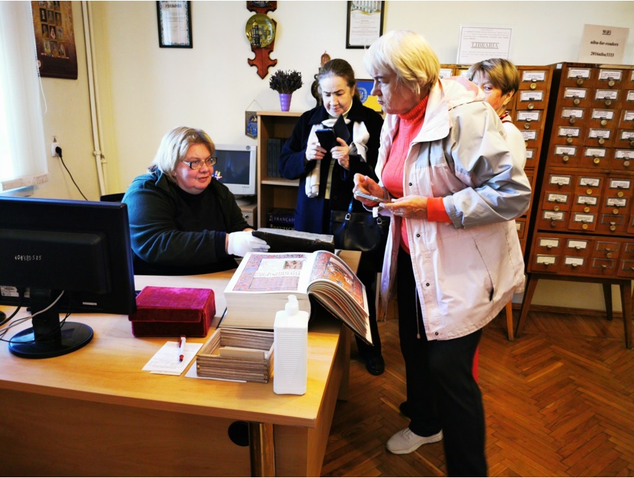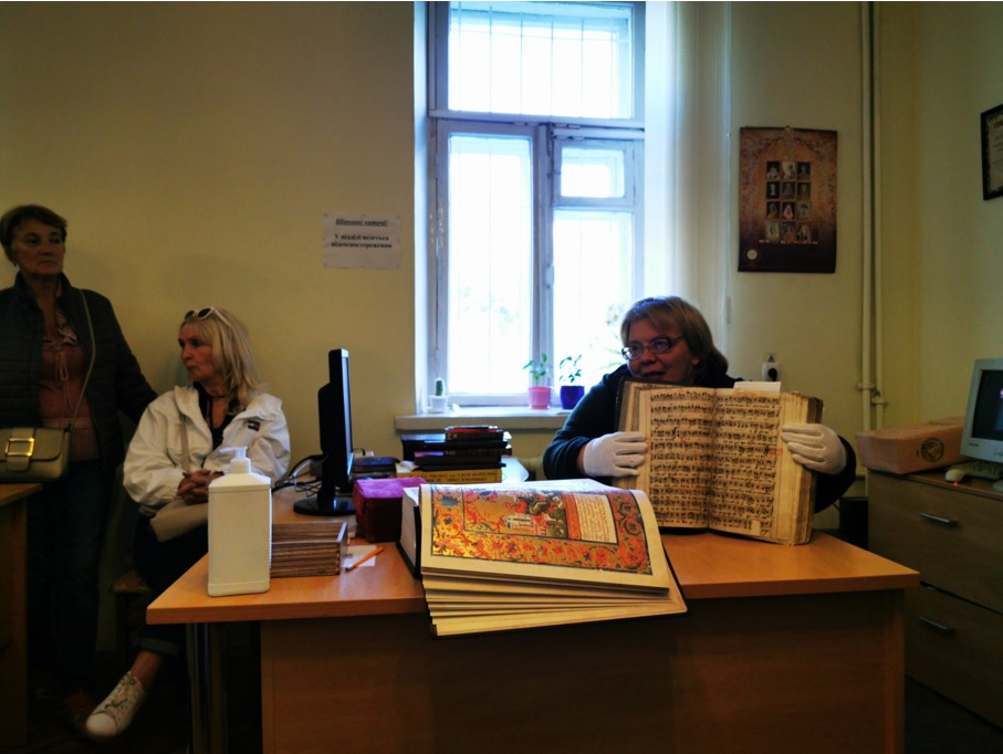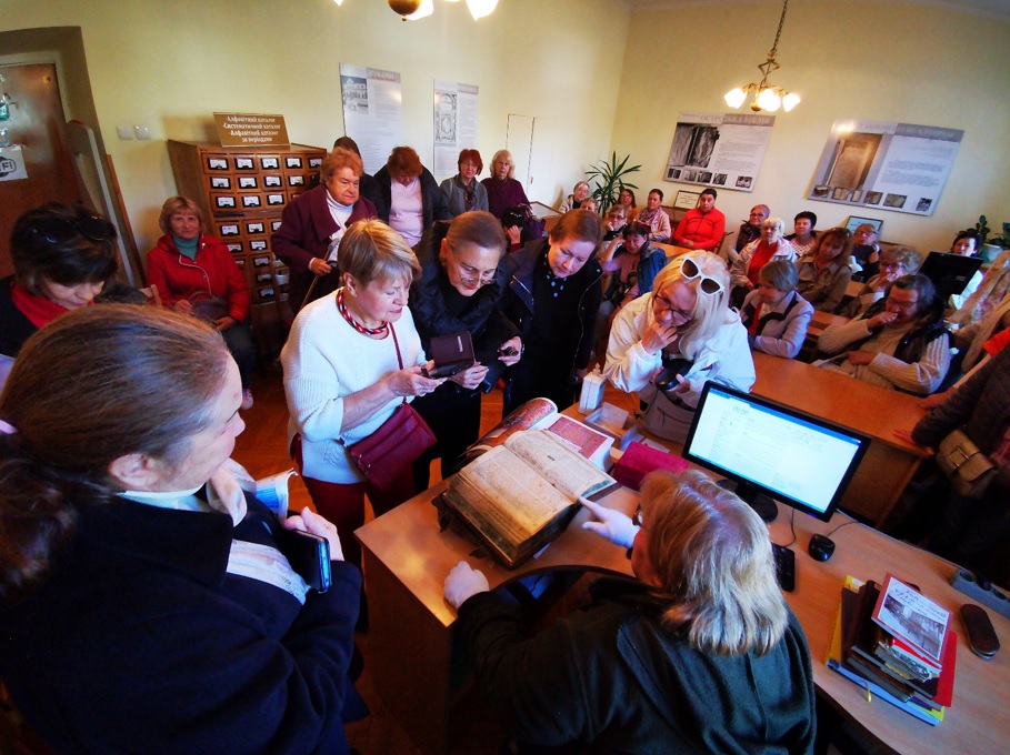 У другій частині екскурсії Оксана Ігорівна Марченко, працівниця науково-дослідного відділу стародруків, цінних та рідкісних видань продемонструвала унікальні видання з фонду Бібліотеки, у тому числі "Біблію" (м. Острог, 1581).