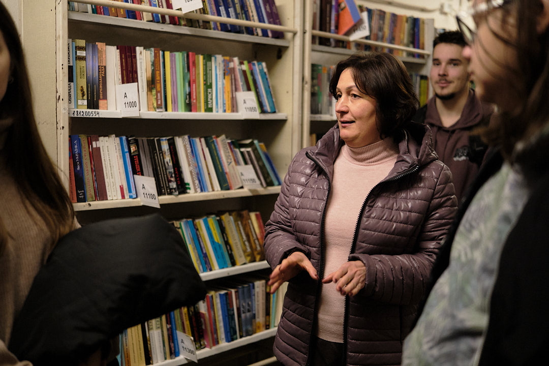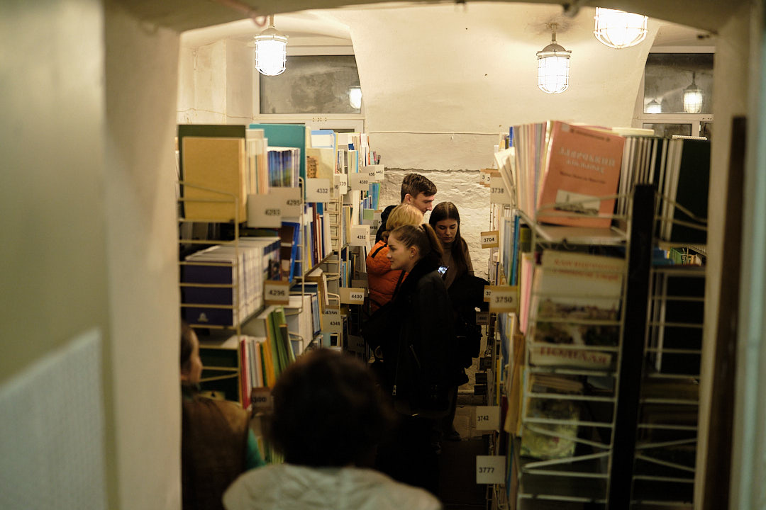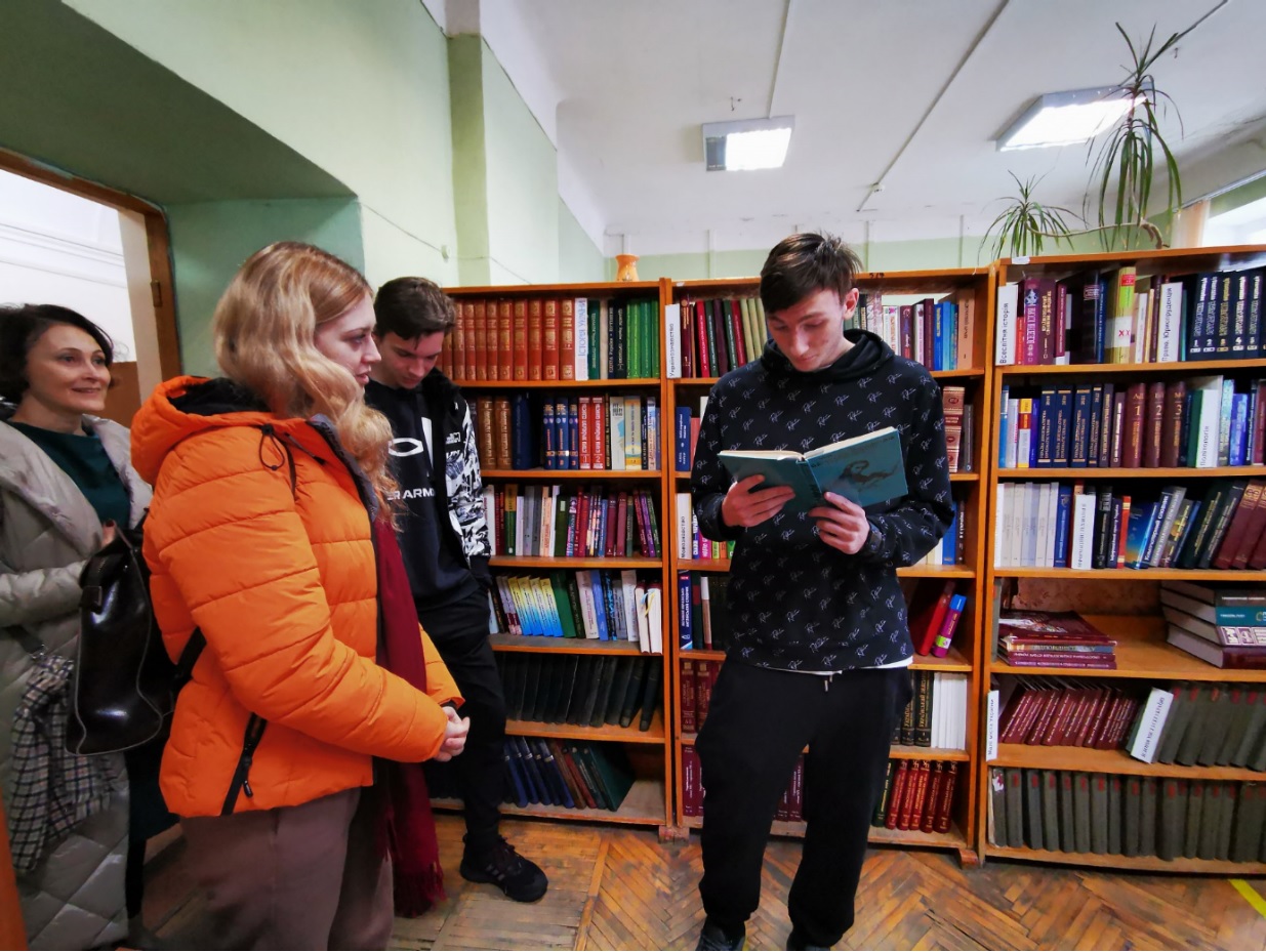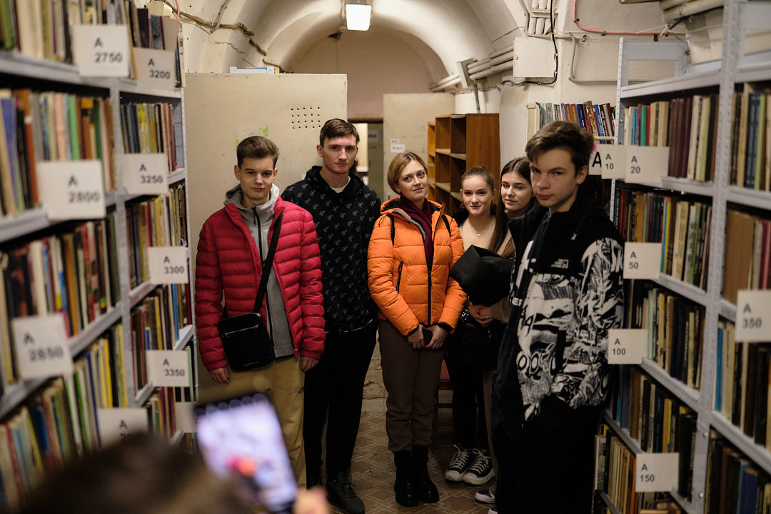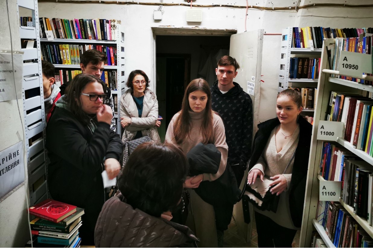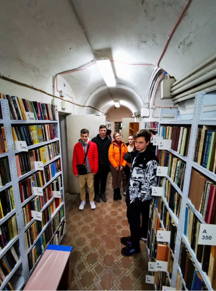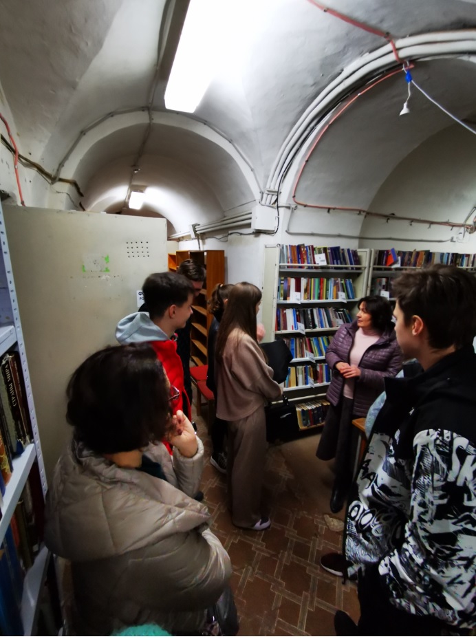 Далі учнів відвели у фонд бібліотеки корпусу № 24, де фахівці відділу організації і зберігання фондів розповіли про фонд книгозбірні, його зберігання, продемонстрували етапи отримання та опрацювання читацьких вимог з відділу обслуговування читачів, підбір літератури та відправки її за допомогою технічного ліфта.