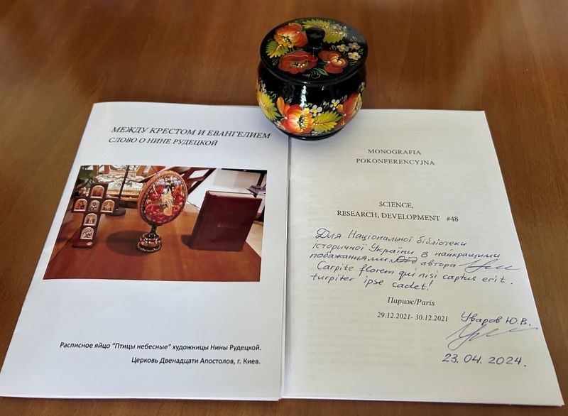 Висловлюємо подяку засновнику і керівнику наукової школи «Прекрасний світ» (м. Київ) Уварову Юрію В’ячеславовичу за подаровану брошуру з дарчим написом «Между крестом и Евангелием. Слово о Нине Рудецкой» до якої ввійшли три статті автора «Коштовності української мови в живописних шкатулках Ніни Рудецької» французькою, українською, російською мовами. Також Юрій В’ячеславович подарував бібліотеці від імені майстрині мальовану дерев’яну скриньку з її підписом.