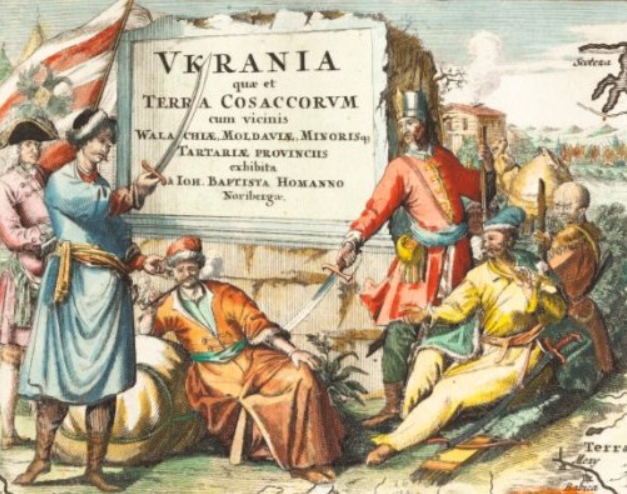 “Україна – земля козаків”. Картуш з мапи України початку XVIII ст. зображення з сайту www.ucrainarma.org