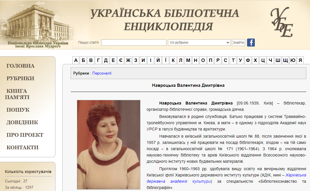 В Українській бібліотечній енциклопедії опубліковано статтю про нашу колегу, подвижницю бібліотечної справи Валентину Дмитрівну Навроцьку, яка з 1996 по 2012р. працювала на посаді заступника директора з бібліотечної роботи Державної історичної бібліотеки України (нині – Національна історична бібліотека України).