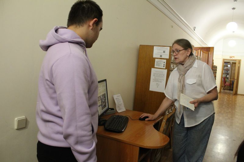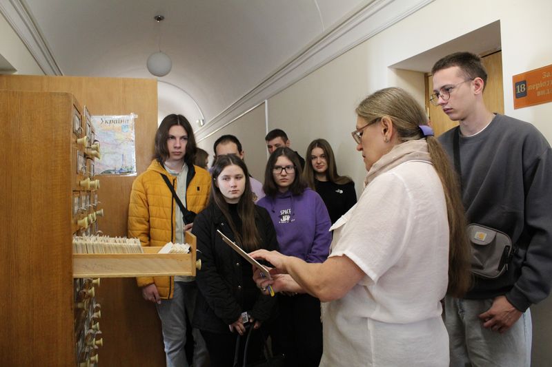 Завідувачка сектором довідково-бібліографічної роботи Оксана Чугіна розповіла про довідково-енциклопедичні видання із фонду відділу, а завідувачка сектором науково-інформаційної роботи Алла Новицька ознайомила екскурсантів із картковим, електронним та імідж каталогами. Вона також провела невелику лекцію із правильного користування каталогами та замовлення книг у традиційному та електронному форматах.