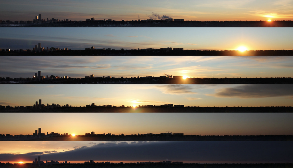 На зображенні: схід сонця у різні пори року. з сайту https://texty.org.ua/fragments/105287/den-pochynaye-dovshaty-os-yak-sonce-shodyt-z-riznyh-bokiv-uprodovzh-roku-foto/