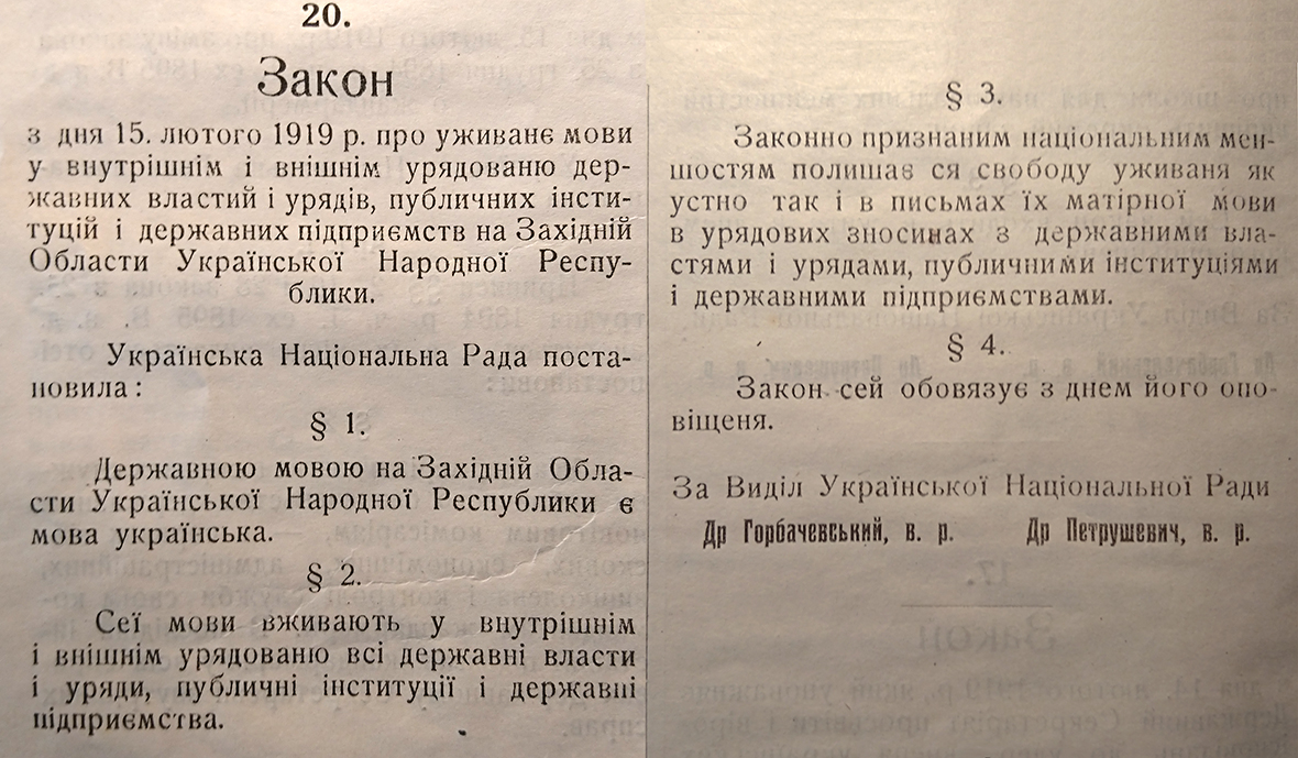 15 лютого 1919 р. Українська Національна Рада ЗУНР затвердила Закон про державну мову. Згідно з яким: