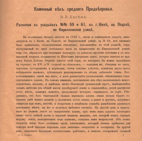 Професор Університету св. Володимира В. Б. Антонович вітав В. Хвойку з його сенсаційним відкриттям на Кирилівській вулиці й заохочував археолога продовжувати розкопки: «проф. Антонович […] своим приездом для осмотра моей находки выразил свое любезное сочувствие и поощрение» (Хвойко, Викентий Вячеславович. Каменный век Среднего Приднепровья / В. В. Хвойко. – Москва : Тип. Г. Лисснера и А. Гешеля, 1901. – 77 с. – На титульному аркуші цього раритетного примірника бачимо дарчий напис, на жаль, частково обрізаний під час пізнішої оправи: «[Уважаемому] Леониду Павловичу Добровольскому от автора». Л. П. Добровольський (1867–1929) – історик, дослідник топографії давнього Києва та його околиць, зокрема, фортифікаційних споруд; дійсний член Історичної секції ВУАН. В. Хвойку та Л. Добровольського пов’язувала спільна праця в Київській губернській архівній комісії та інших наукових інституціях. Свою бібліотеку Л. П. Добровольський заповів Історичній секції. Відбиток печатки: «Бібліотека Інституту історії матеріал. культури», – свідчить про те, що із заснуванням у 1933 р. Інституту історії матеріальної культури цей раритет разом з іншими книгами був переданий з Історичної секції ВУАН до бібліотеки ІІМК).