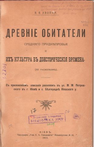 Хвойко, Викентий Вячеславович. Начало земледелия и бронзовый век в Среднем Поднепровье / В. В. Хвойко. – Москва : Тип. Г. Лисснера и Д. Собко, 1907. – 8 с. – Друкований екслібрис «Из библиотеки В. И. Гошкевича».