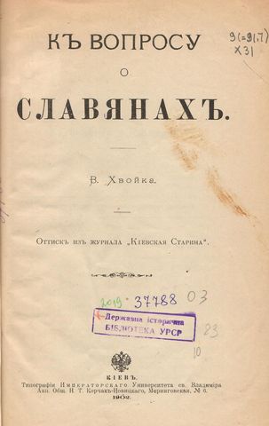 Хвойка, Викентий Вячеславович. К вопросу о славянах : [оттиск из журнала «Киевская старина»] / В. В. Хвойка. – Киев, 1902. – 11 с.
