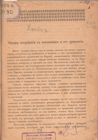 Хвойка, Викентий Вячеславович. Обряд погребения с сожжением и его древность / В. В. Хвойка. – [Киев], [1906]. – 11 с.