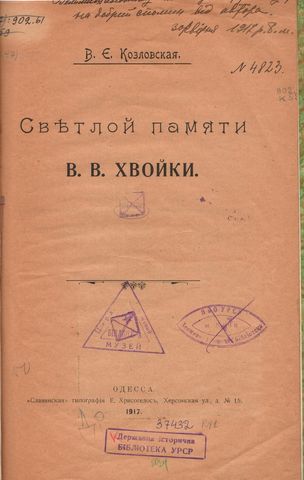 Хвойка, Викентий Вячеславович. Древние обитатели Среднего Приднепровья и их культура в доисторические времена (по раскопкам) : с приложением описания раскопок в ус. М. М. Петровского в г. Киеве и с. Белгородке Киевского у. / В. В. Хвойка. – Киев : Тип. Т-ва Е. А. Синькевич, 1913. – 101 с. – [У 1923 р. Валерія Євгенівна Козловська як розпорядник архіву В. Хвойки передала цей примірник до бібліотеки Кабінету Антропології та Етнології ім. Хв. Вовка].