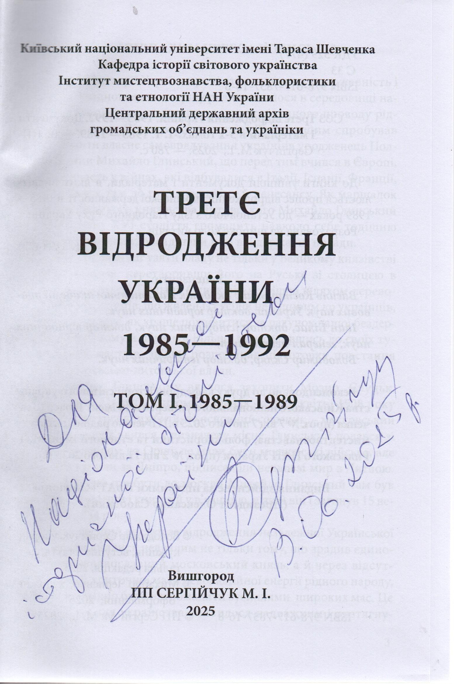 Третє відродження України. 1985-1992. Документи і матеріали в 3-х томах. Т. 1 : 1985-1989. – Вишгород: ПП Сергійчук М. І., 2025. – 780 с. До книги увійшли документи і матеріали, в яких висвітлюється процес відродження української державності в 1985-1989 роках – до Установчого з’їзду Народного Руху України. |