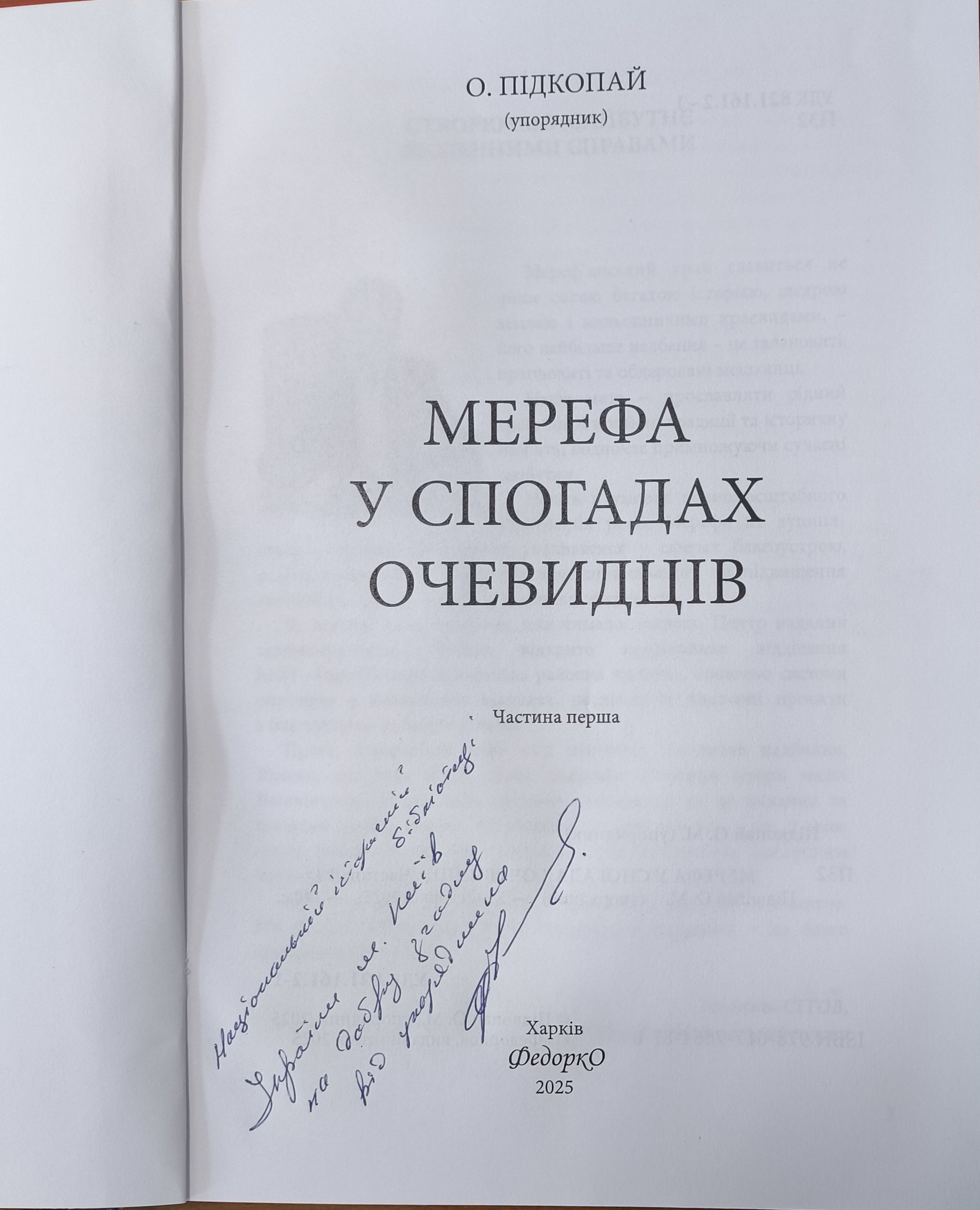 Спогади багатьох авторів, зібрані у подарованому виданні, упорядковані відомим українським поетом і прозаїком Олександром Миколайовичем Підкопаєм – лауреатом численних літературних премій, членом творчої асоціації літераторів «Слобожанщина», членом НСПУ, почесним громадянином м. Мерефи, автором шести альбомів світлин старожитностей «Мерефа і мереф’яни».