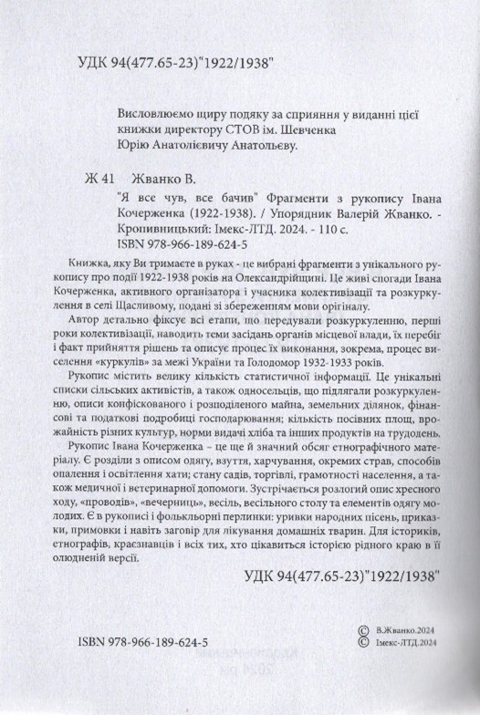 Книга «Я все чув, все бачив (1922 – 1938)» містить фрагменти з рукопису про події 1922 – 1938 років Олександрійщині. Це живі спогади Івана Кочерженка, активного організатора і учасника колективізації та розкуркулення в селі Щасливому. Спогади Івана Кочерженка є підтвердженням штучно створеного геноциду українців.