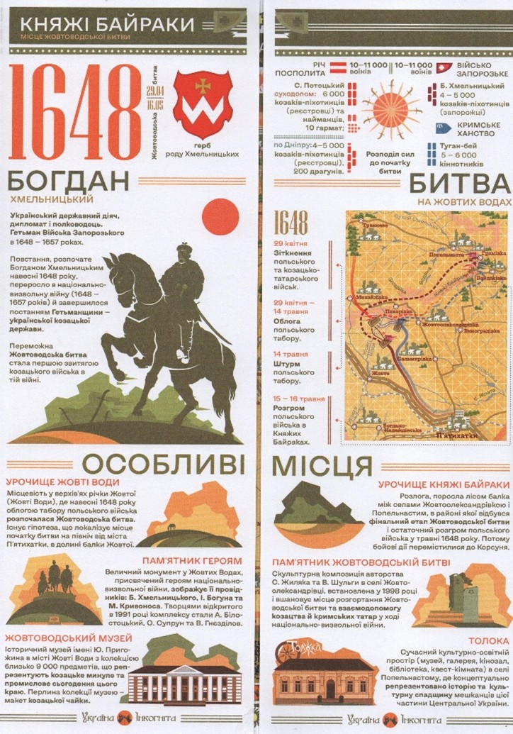 Путівник «Княжі байраки» про битву під Жовтими Водами 1648 року. Його підготували у Попельнастівській громаді Олександрійського району Кіровоградської області. На території цієї громади, а також поряд, на землях нинішньої Дніпропетровської області, відбувся перший переможний бій українського війська під проводом Богдана Хмельницького проти Речі Посполитої.