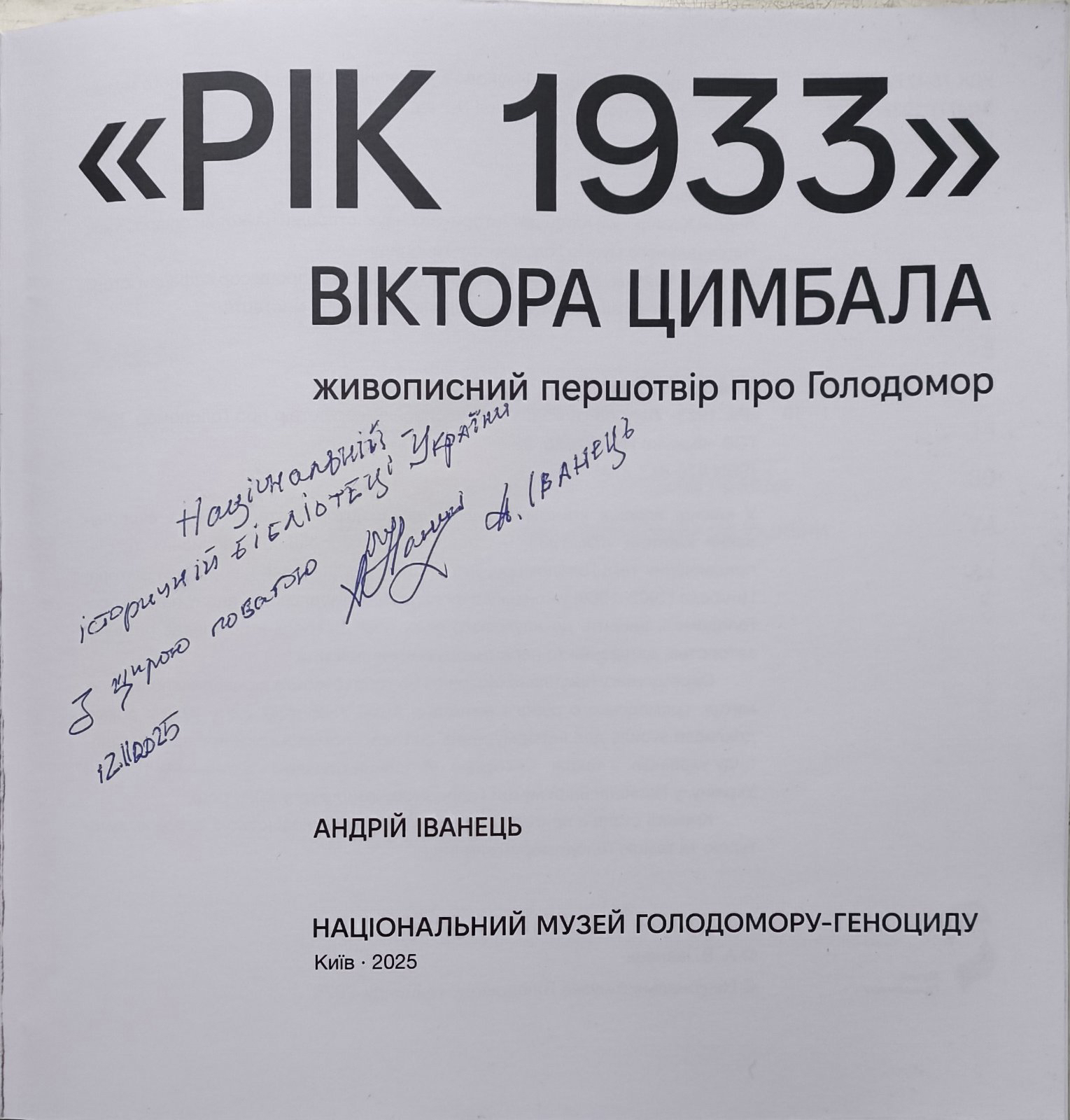 Висловлюємо подяку Національному музею Голодомору-геноциду, всьому авторському колективу та особисто автору Андрію Іванцю, канд. істор. наук, провідному науковому співробітнику Національного музею Голодомору-геноциду, за подаровану книгу «Рік 1933» Віктора Цимбала – живописний першотвір про Голодомор. Київ. 2025, яка поповнила фонд Національної історичної бібліотеки України.