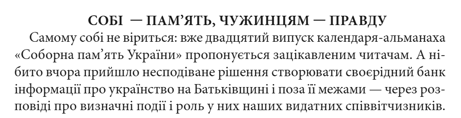 У пропонованому календарі-альманасі наводяться найзнаменніші події української історії та згадуються найвизначніші постаті нашого народу, яких ушановуємо в 2026 році.