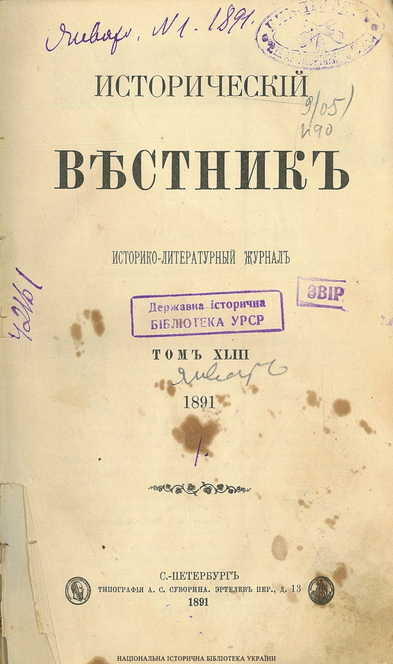 Исторический вестник : историко-литературный журнал. 1891. № 1 (Январь). - Санкт-Петербург : Тип. А. С. Суворина, 1891. : іл. + 1 вкл. л. портр.