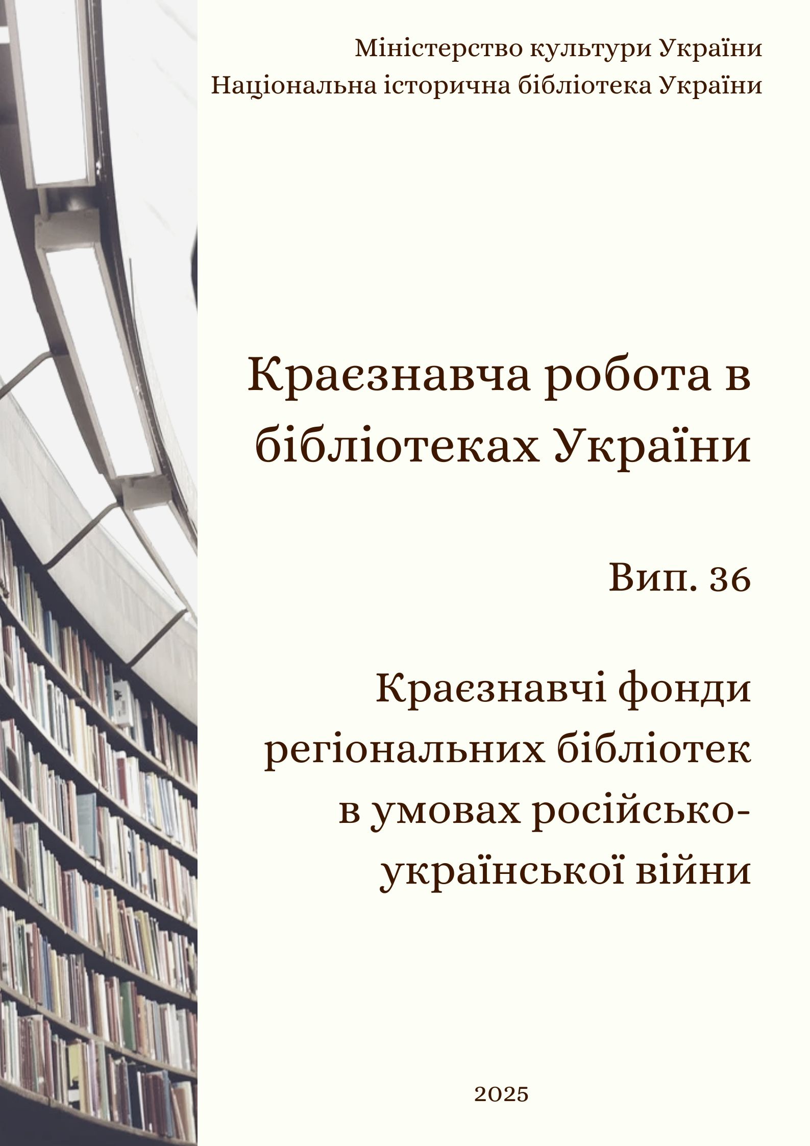 Вашій увазі пропонується 36-й випуск інформаційного бюлетеня "Краєзнавча робота в бібліотеках України", у якому оприлюднено результати дослідження "Краєзнавчі фонди регіональних бібліотек в умовах російсько-української війни". Окремий розділ Бюлетеня містить публікації фахівців обласних універсальних наукових бібліотек, у яких висвітлюються практичні напрацювання у краєзнавчій бібліотечній діяльності.