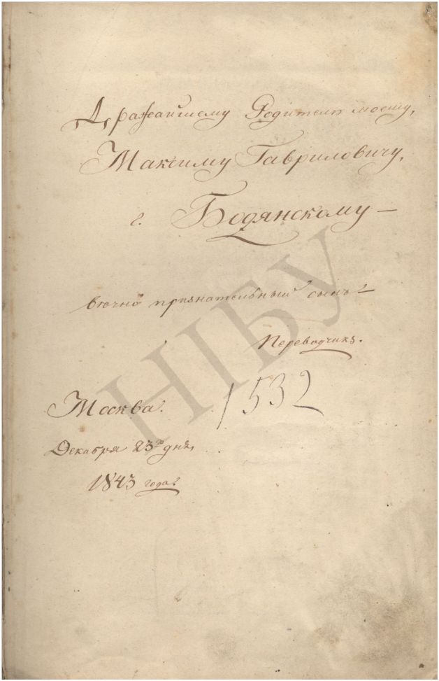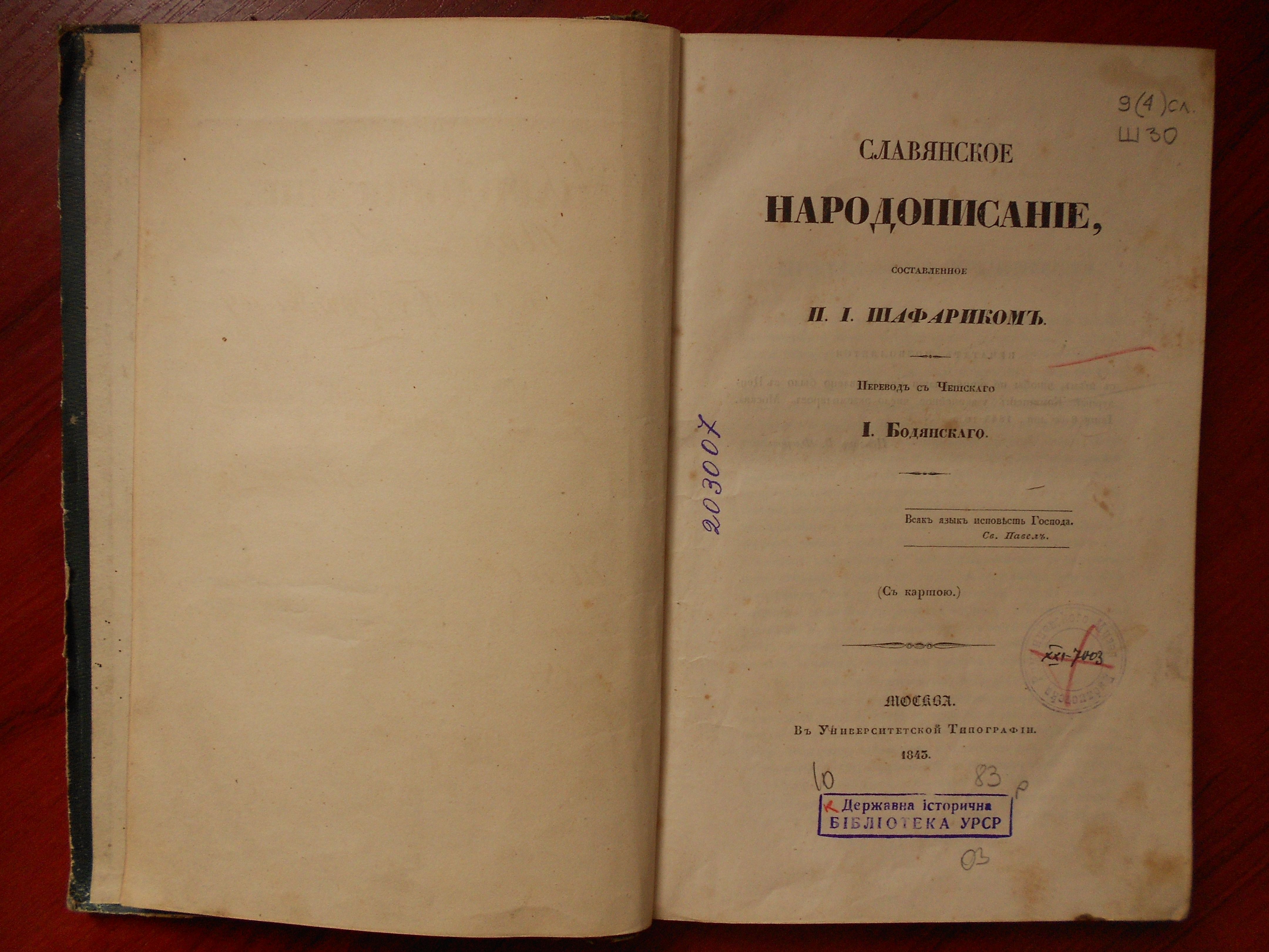 Ми не могли не представити читачам унікальний екземпляр Шафарикового «Славянского народописания», перекладеного й виданого О. М. Бодянським з дарчим написом перекладача його батькові – священику Максиму Гавриловичу Бодянському..