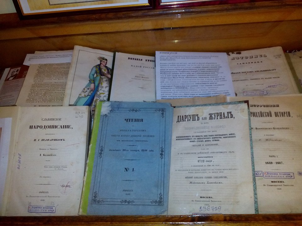 В першому розділі виставки представлені публікації перших років «Чтений»: першодрук «Истории Русов или Малой России» (1846) та «О Патерике Печерском» (1847). Презентуються також перевидання окремими книгами «Літопису Самовидця», Міллерових «Исторических сочинений о Малороссии» та «Летописного повествования о Малой России» О. Рігельмана (з ілюстрацією з цього останного видання). На виставці представлене, крім першодруку, і наукове видання «Истории Русов» 1991 року*.