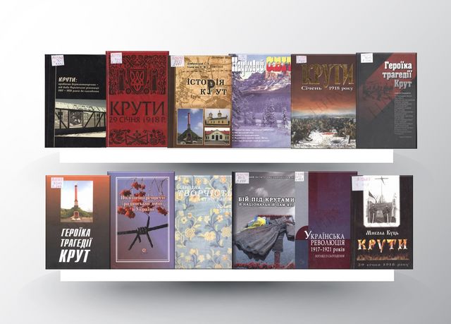 Оглянувши виставку Ви познайомитесь з виданнями, що розкривають історичний перебіг бою під Крутами: статті про значення Крутів в українській історії, частковий список Крутянців, а також присвячені їм поезії.
