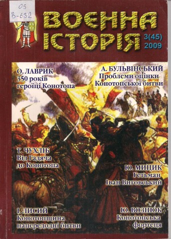 Воєнна історія : науково-популярний журнал. – Київ : Український інститут воєнної історії, 2009. – №3(45). - 110 с. Номер журналу присвячений 350-річчю битви під Конотопом. Автори пропонують неупереджено поглянути і правильно визначити значення Конотопської битви для української історії, спробувати пом’якшити ті жорсткі характеристики і оцінки, які отримував гетьман Виговський протягом 350 років. |