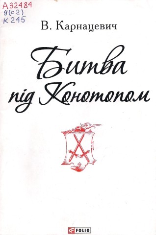 Карнацевич В.Л. Битва під Конотопом / В. Карнацевич, худож.-оформлювач О. Д. Кононученко. – Харків: Фоліо, 2015. – 63 с. На сторінках цієї книги автор спробував розглянути конотопські події, їх місце у війні, яку гетьман Іван Виговський вів з Москвою. Окремі глави присвячені: початку формувань відносин між двома державами в епоху Б. Хмельницького; особі І. Виговського і причинам загострення відношень гетьманського уряду і північних сусідів; повстанню, що підняли проти Виговського Пушкар і Барабаш; Гадяцькій угоді, яка стала останньою краплею для Москви, що втратила надію дістатися злагоди з гетьманом. |