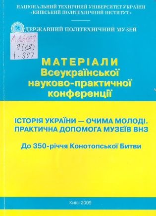 Історія України - очима молоді. Практична допомога музеїв ВНЗ : до 350-річчя Конотопської битви. Матеріали Всеукраїнської науково-практичної конференції Київ, 14-15 грудня 2009 р. / Національний технічний університет України «КПІ», Державний політехнічний музей при НТУ «КПІ» ; уклад. С. М. Ховрич. - Київ, 2009. - 118 с. Збірка присвячена вивченню і популяризації історії України у вищих навчальних закладах та ролі музеїв у цьому процесі, а також різноманітним аспектам вітчизняної історії національно-патріотичного спрямування. |