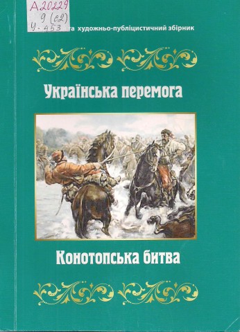Українська перемога - Конотопська битва : художньо-публіцистичний збірник / упоряд. Ф.А. Сухоніс. - Дніпропетровськ : Пороги, 2009. - 188 с. Конотопська битва продовжує привертати увагу дослідників саме через нез’ясованість багатьох своїх обставин. Самій битві передував період тривалої облоги фортеці Конотоп великим царським військом. Тривалий час в історичній науці України насаджувалися ті концепції та погляди на історичне минуле, які не суперечили інтересам нашої держави. Автори закликають шанувати і вивчати власну історію. |