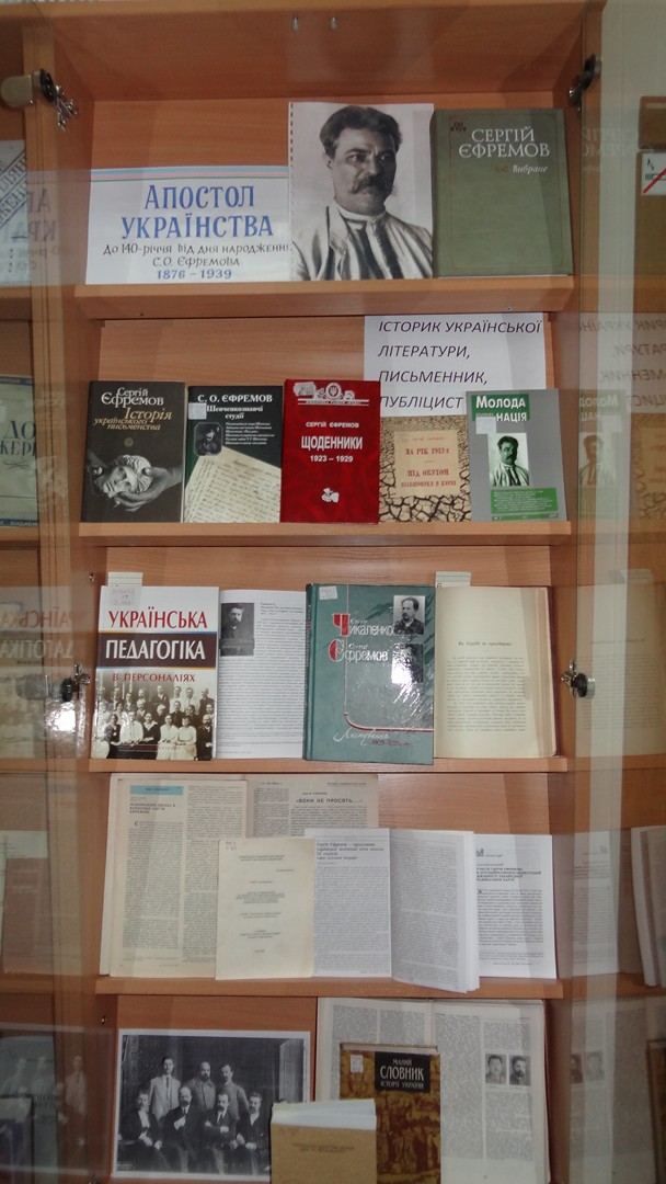Шановні користувачі! З 5 жовтня у Виставковому залі в рамках рубрики «Репресована інтелігенція України» експонується книжкова виставка «Апостол українства», присвячена 140-річчю від дня народження Сергія Олександровича Єфремова (1876–1939), історика української літератури, письменника, публіциста.
