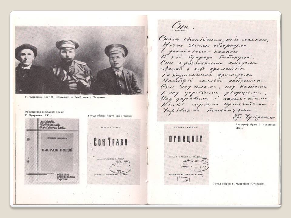 27 листопада 1879 народився український поет-модерніст і політик Григорій Аврамович Чупринка (Грицько Чупринка; 1879-1921), борець за незалежність України. Виходець із козачого роду. Був посаджений у в'язницю за участь у революції 1905 року. З 1910 року постійно жив у Києві. Автор збірок віршів «Огнецвіт», «Метеор», «Ураган» (1910), «Сон-трава», «Білий гарт» (1911), «Контрасти» (1912), поеми «Лицар-Сам» (1913), а також літературно-критичних статей і рецензій.
