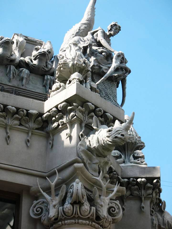 Будинок з химерами побудований в стилі модерн. Його було зведено за рік. Ще два роки тривало декорування. Це був перший будинок у Києві, побудований з використанням нового матеріалу – цементу. І зовнішнє оформлення будинку, і внутрішні інтер’єри неповторні. Спочатку будинок будувався, як прибутковий. Шість із семи квартир здавалися в оренду заможним людям. Окремий поверх займала квартира творця цього дива – архітектора Городецького. Стіни передпокою, наприклад, вкриті розписами. Тут і підводний світ, і затонулі кораблі, і ліпнина у вигляді спрута на стелі. Звідси на верхні поверхи ведуть сходи з білого мармуру. Між четвертим та п’ятим поверхами на сходах встановлено світильник у вигляді гігантського сома. У колишній вітальні Городецького сьогодні розташовано малий переговорний зал. Тут є піч, викладена керамічними кахлями дивовижної краси. А от ліпнина в їдальні зображує різні овочі: тут можна розглянути і часник, і артишоки, і буряк…