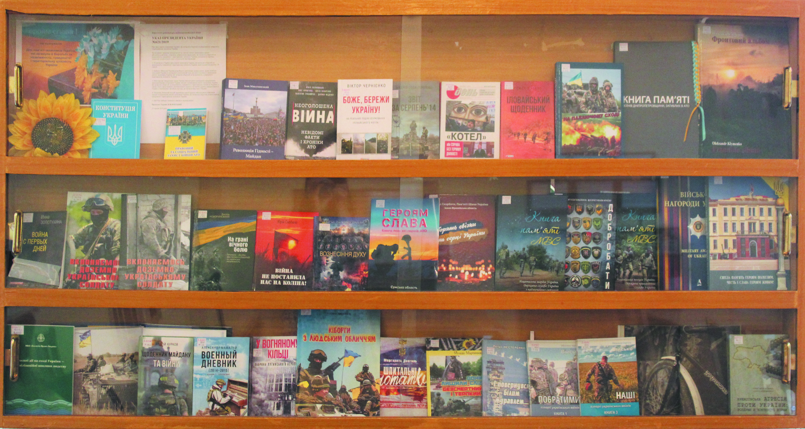Бібліографічний список: Конституція України : станом на 10 серпня 2015 р. - Офіційний текст. - Київ : Алерта, 2015. - 78 с. Війна очима ТСН : 28 історій по той бік камери / О. Кашпор. - Київ : Основи, 2016. - 213, [6] с. : фот. Вклоняємось доземно українському солдату / [упоряд. : Р. Драпак, Н. Ткачук ; літ. ред. Т. Король]. - [2-е вид.]. - Київ : Народна армія, 2015. - 195 с. : іл., фот. Вклоняємось доземно українському солдату / літ. ред. Т. Король. - 4-е вид. - Київ : Народна армія, 2017. - 195 с. : іл. Власюк О. С. Кремлівська агресія проти України: роздуми в контексті війни : монографія / Олександр Степанович Власюк, С. В. Кононенко ; Нац. ін-т стратег. дослідж. - Київ : НІСД, 2017. - 304 с. Воєнні дії на сході України - цивілізаційні виклики людству : посіб. / О. Мелень-Забрамна [та ін.] ; ред. О. Кравченко ; МБО «Екологія–Право–Людина». - Львів : ЕПЛ, 2015. - 132 с. : схем., табл., фот. Вознесіння духу. Книга пам’яті Героїв АТО та Небесної Сотні Вінничини / В. М. Щербань ; Благодійний фонд «Блаженні милостиві». - Вінниця : Рогальська І. О., 2015. - 140 с. : іл. Героям Слава. Книга пам’яті героїв АТО. Сумська область / Сумська облдержадмін., Сумська обл. рада ; авт. проекту Є. Положій. - Суми : Всі Суми Панорама-Медіа, «Еллада S», 2016. - 112 с. : іл. Горять свічки на серці України / Пошуково-видавн. агенство «Книга Пам’яті України», Івано-Франків. обл. від. ; ред. кол. І. М. Пасічняк [та ін.]. - 2-е вид., допов. - Івано-Франківськ : Місто НВ, 2018. - 315 с. : іл. - (Книга Скорботи, Пам’яті і Шани України. Івано-Франківська область). Добробати : історія подвигу батальйонів, що врятували країну / К. Гладка [та ін.]. - 2-е вид., перероб. і допов. - Харків : Фоліо, 2017. - 324, [2] с. : іл. Довгань М. Шпитальні нотатки. Лютий 2015 р.–березень 2018 р. / Маргарита Довгань. - Київ : Кліо, 2018. - 286, [2] с. : іл. Зіненко Р. Іловайський щоденник : пер. з рос. / Роман Зіненко. - Харків : Фоліо, 2017. - 286 с. : іл. Золотухина И. В. Война с первых дней / Инна Владимировна Золотухина. - Харьков : Фолио, 2015. - 223 с. : 16 л. фот. Карпов В. В. Військові нагороди України / Віктор Васильович Карпов. – Київ : Балтія-Друк, 2018. – 80 с. : іл. Клименко О. П. Фронтовий альбом / Олександр Петрович Клименко. - Київ : АВІАЗ, 2016. - 239 с. : фот. - Укр., англ. Книга Пам’яті МВС. Національна гвардія України. Державна служба України з надзвичайних ситуацій / А. Шевченко [та ін.] ; упоряд. О. Красовицький. - Харків : Фоліо, 2017. - 367 с. : іл. Книга Пам’яті МВС. Національна поліція України. Державна прикордонна служба України / А. В. Шевченко [та ін.]. - Харків : Фоліо, 2017. - 368 с. : іл. Книга Пам’яті воїнів Дніпропетровщини, загиблих АТО / Дніпропетровська облрада ; авт.-упоряд.: Т. В. Войцеховська, С. О. Капустіна, В. В. Якушенко. - Дніпро : Свідлер А. Л., 2017. - 191 с. : портр., фот. «Котел», або Справа без терміну давності / ред. Л. Івшина ; упоряд. І. Капсамун ; відп. ред. А. Мотозюк. - 2-е вид., допов. - Київ : Укр. прес-група, 2016. - 271 с. : іл. - (Новітня історія для «чайників»). Курков А. Ю. Щоденник Майдану та Війни / Андрій Юрійович Курков ; пер. В. С. Бойко ; худож. В. М. Карасик. - Харків : Фоліо, 2018. - 329, [4] с. Магда Є. Гібридна агресія Росії: уроки для Європи / Євген Магда. - Київ : Kalamar, 2017. - 267 с. : фот. Мамалуй А. А. Военный дневник (2014–2015) / А. А. Мамалуй. - 2-е изд., доп. - Харьков : Фолио, 2018. - 296, [2] с. : фот. Мартинюк М. В. Вони лишили слід безсмертний і терпкий / М. В. Мартинюк. - Житомир : Рута, 2017. - 100 с. : іл., фот. Микулинський І. М. Революція Гідності - Майдан / І. Микулинський. - Чернівці : Друк Арт, 2017. - 798 с. : 32 вкл. арк. фот. На палаючому Сході / упо