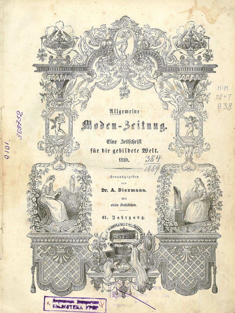 Німецьке видання «Allgemeine Moden-Zeitung. Eine Zeitschrift für die gebildete Welt» (Загальна модна газета. Журнал для освіченого світу) Allgemeine Moden-Zeitung. Eine Zeitschrift für die gebildete Welt: сборник . – Leipzig : [s. n.], 1806-1903. 1834: №27-52, випуск 27 1842: №27-50, випуск 44 1845: №1-26, випуск 47 1859: №1-25 , випуск 61 1866: № 1-20, випуск 68 |