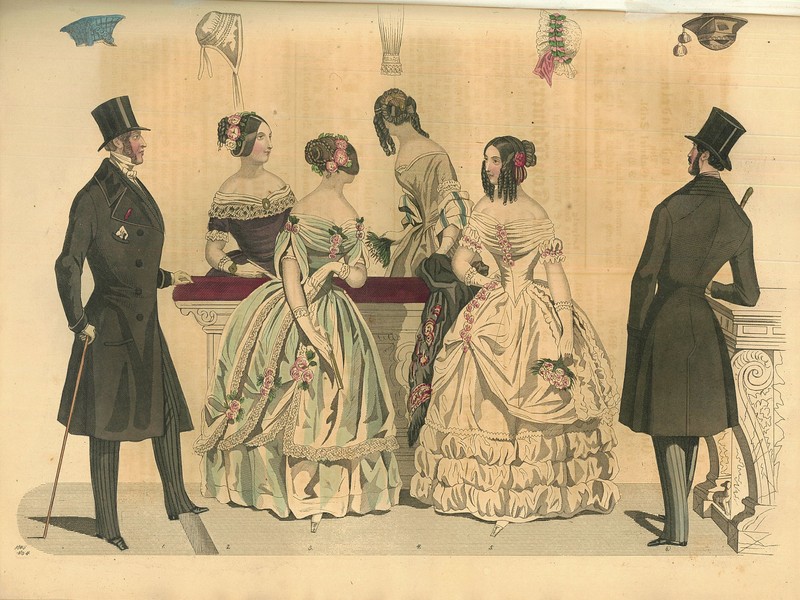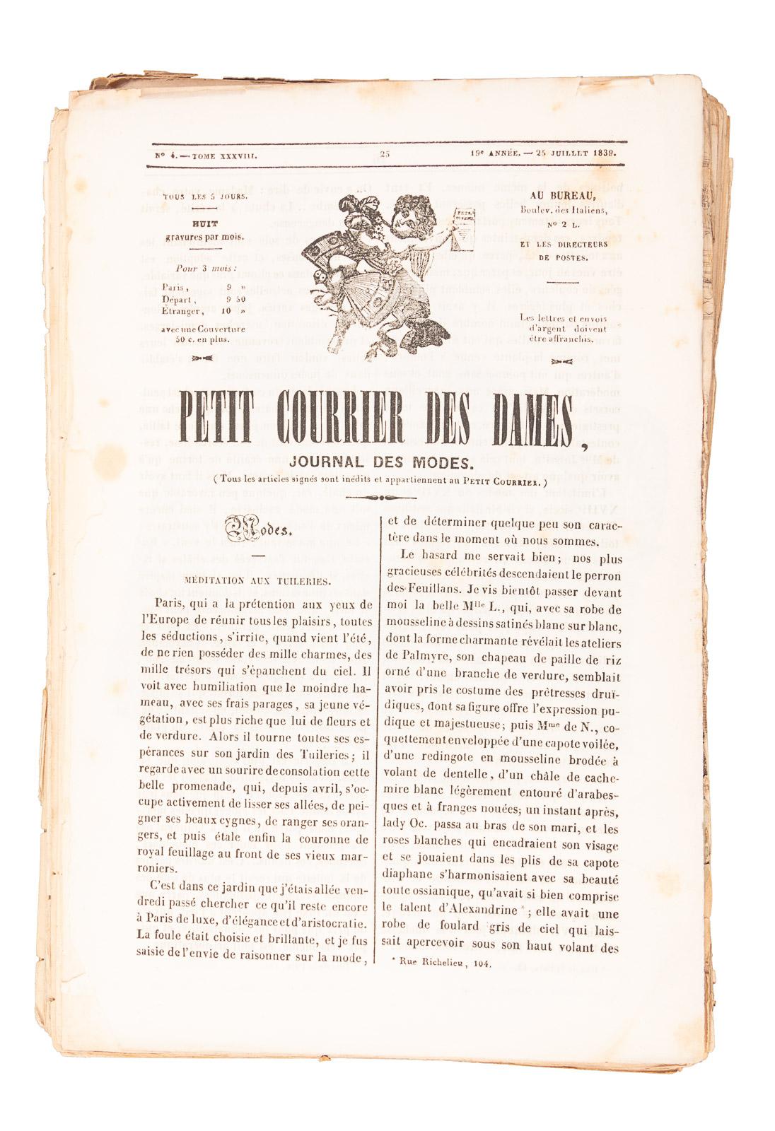 Збірка оригінальних кольорових гравюр з популярного паризького журналу «Petit courrier des dames: Journal des modes» (Дамський кур’єр: журнал мод) за 1824 рік Журнал з'являвся кожні 5 днів з однією або двома якісними гравюрами модних новинок того часу в кожному випуску під заголовком «Modes de Paris», ілюструючи модний одяг та аксесуари з назвами та адресами паризьких кравців, перукарів, квітникарів та ювелірів, де їх можна було придбати. |