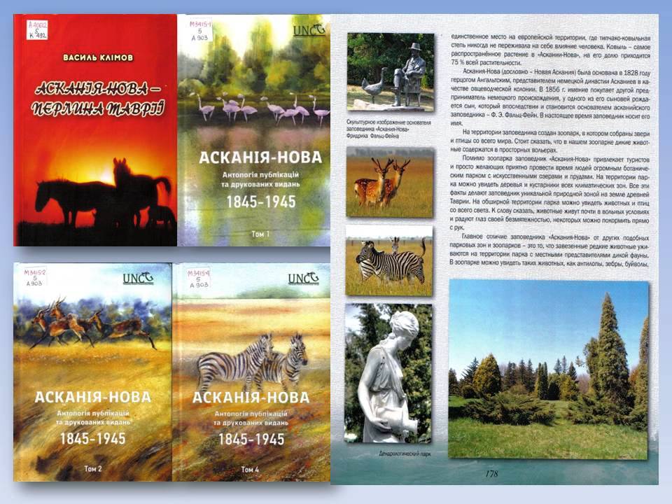 Гавриленко В. С. Асканія-Нова – поєднання краси таврійських степів і людського генія [Текст] / В. С. Гавриленко ; Національна академія аграрних наук України, Біосферний заповідник “Асканія-Нова” імені Ф. Е. Фальц-Фейна. - Київ : Аграрна наука, 2015. - 264 с. : іл.