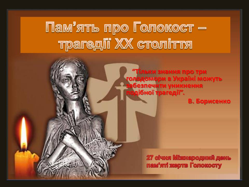 Україна вперше на державному рівні вшанувала пам'ять жертв Голокосту у 2012 році. Про голод в Україні стали розповідати після грудня 1987 року. З’явилися статті в ЗМІ, розпочались наукові дослідження, пошуки документів в архівах. І спочатку мова йшла тільки про Великий Голод 1932 – 1933 років. Пізніше згадали і вже як єдиний ряд і голод 1921 – 1923 років, і голод 1946 – 1947 років.