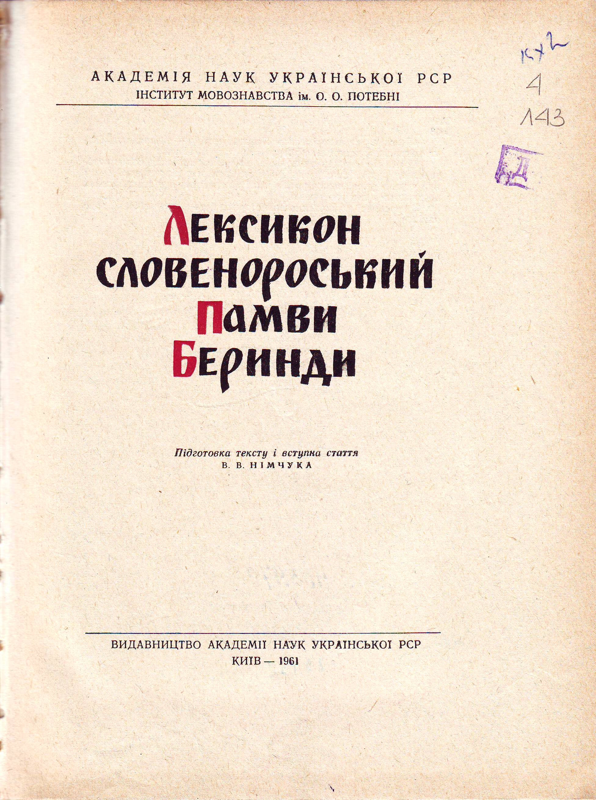 Лексикон словенороський Памви Беринди / вступ. ст., підгот. тексту В. В. Німчук ; відп. ред. Кирило Кузьмич Цілуйко, Інститут мовознавства ім. О. О. Потебні АН УРСР. – Київ : Видавництво АН УРСР, 1961. – 272 с. – (Пам'ятки української мови XVII ст. : серія наукової літератури) «Лексикон словенороський» П. Беринди — одна з кращих праць східнослов'янської лексикографії XVII ст. У друкованому вигляді і в численних рукописних копіях словник Памви Беринди був поширений на Україні, в Росії і Білорусії, а також використовувався укладачами пізніших східнослов'янських словників. Він відіграв важливу роль в історії української, російської, білоруської і навіть румунської лексикографії. |