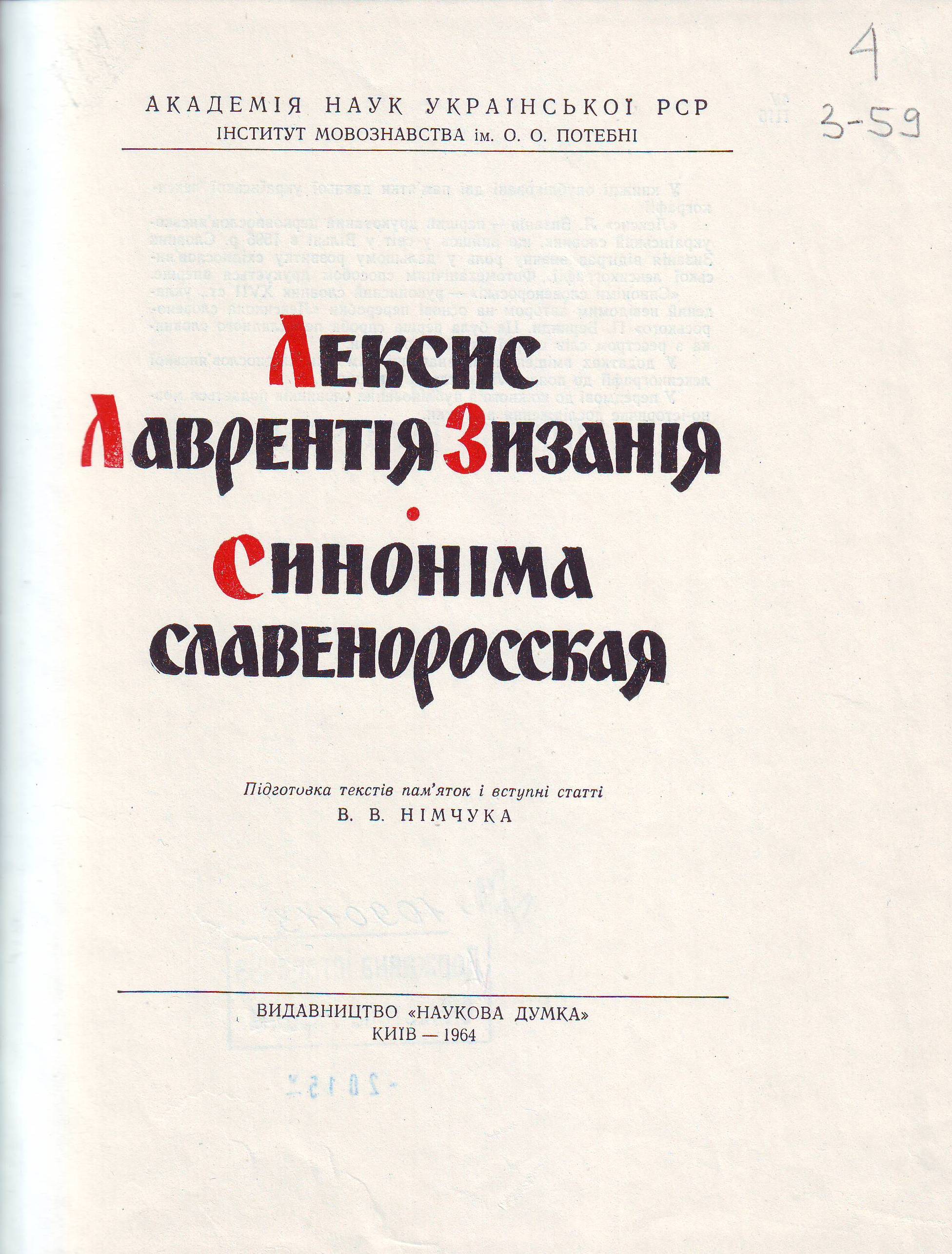 Лексис Лаврентія Зизанія. Синоніма славеноросская / вступ. ст., підгот. тексту В. В. Німчук ; Інститут мовознавства ім. О. О. Потебні АН УРСР. - Київ : Наукова думка, 1964. – 195 с. – (Пам'ятки української мови : серія наукової літератури) «Лексис» Л. Зизанія — перший друкований церковнослов’янсько-український словник, що вийшов у світ у Вільні в 1596 р. Словник Зизанія відіграв значну роль у дальшому розвитку східнослов’янської лексикографії. Фотомеханічним способом друкується вперше. |