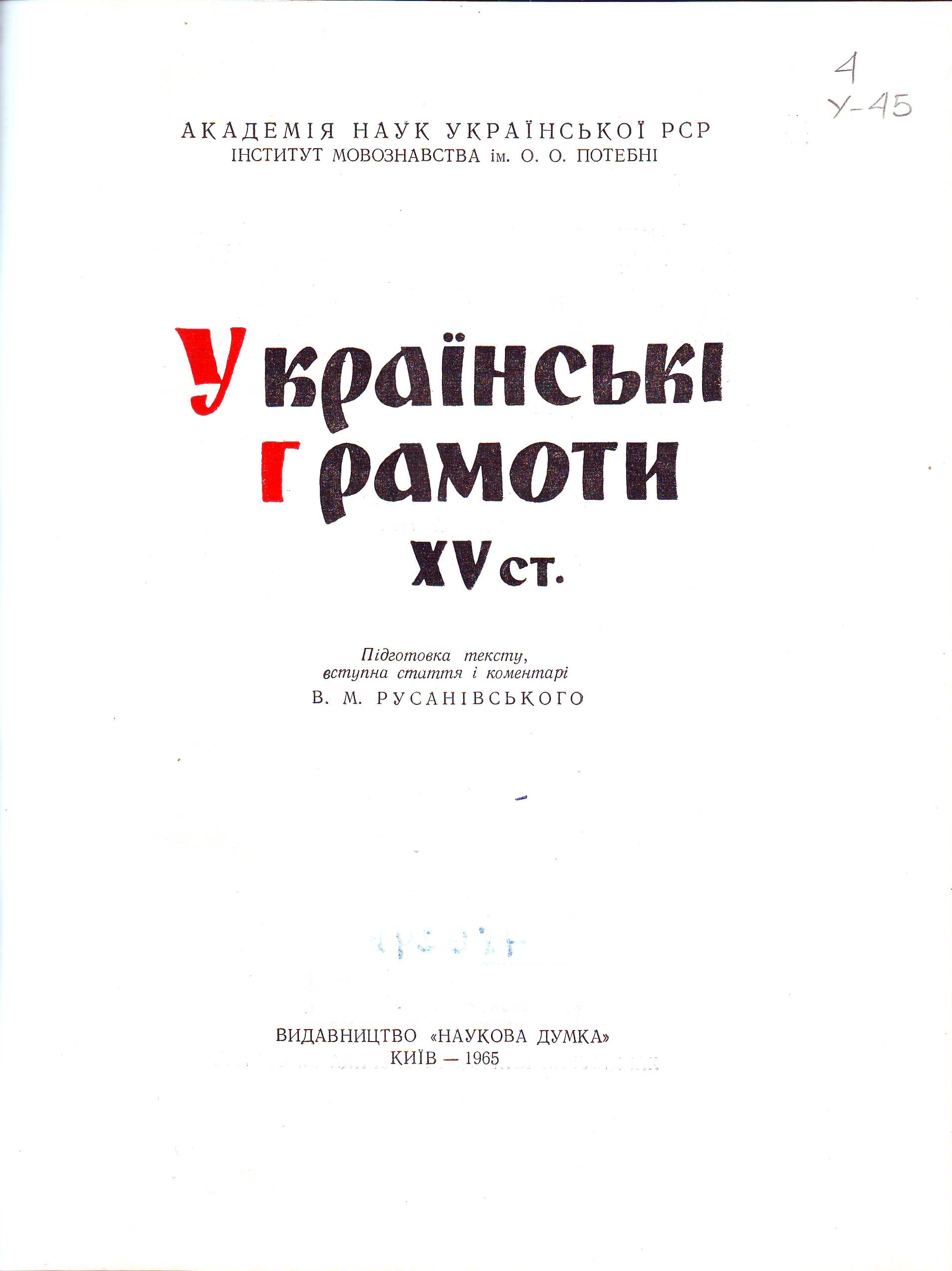 Українські грамоти XV ст. / підгот. тексту, вступ. ст., коментарі В. М. Русанівського ; Інститут мовознавства ім. О. О. Потебні АН УРСР. — К.: Наукова думка, 1965. — 164 с. – (Пам'ятки української мови : серія юридичної літератури) У книзі зібрані українські грамоти XV ст., які раніше або зовсім не публікувалися, або були опубліковані у виданнях, що не призначалися для мовознавчих досліджень. Грамоти згруповані за їх територіальним походженням: окремо подані грамоти центральної України, Західного Полісся, Галичини, українські грамоти з території Молдавії, закарпатська грамота. Кожна грамота супроводжується палеографічним коментарем. |