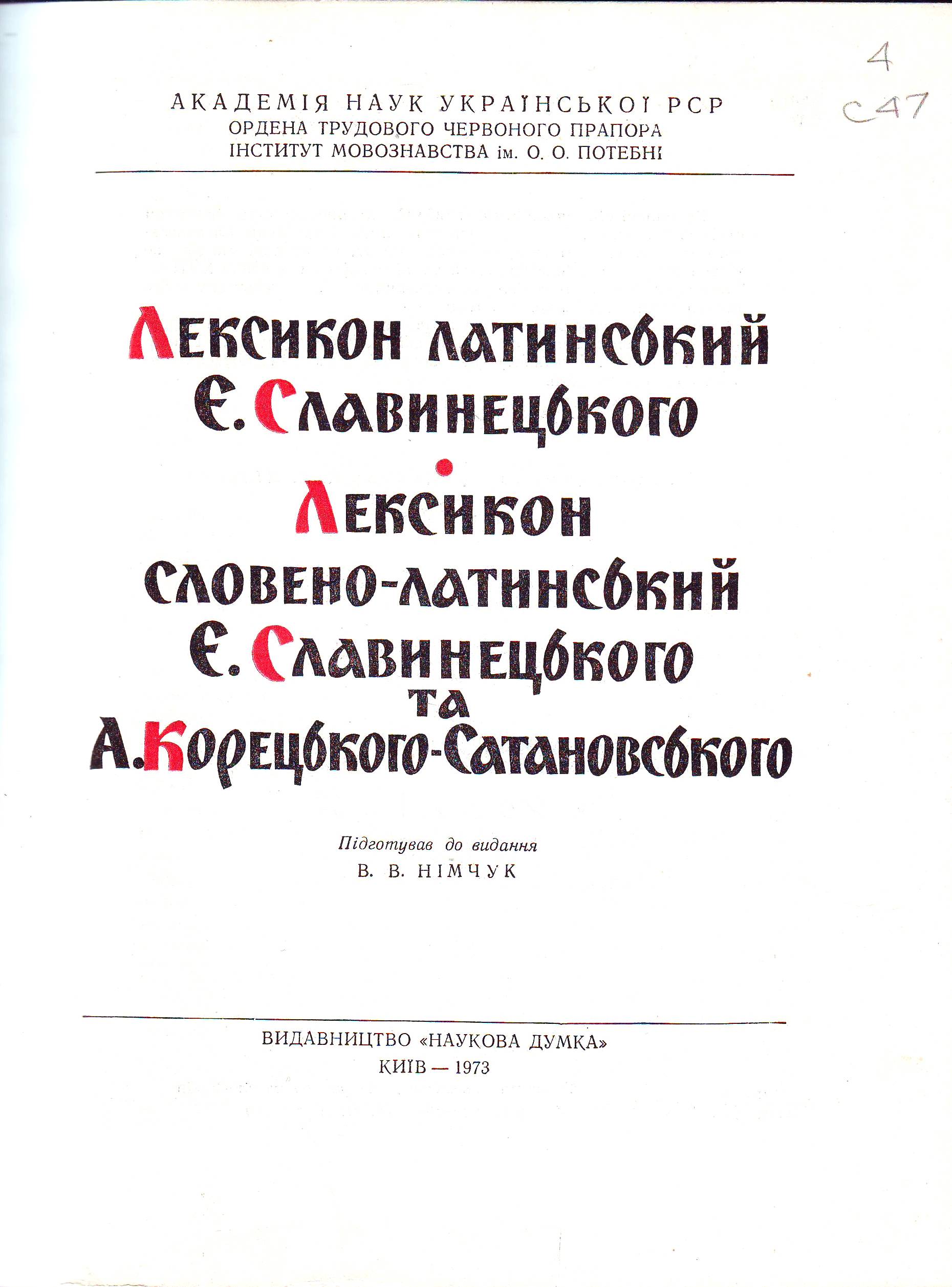 Лексикон латинський Є. Славинецького. Лексикон словено-латинський Є. Славинецького та А. Корецького-Сатановського / підгот., передм. Василь Васильович Німчук ; відп. ред. Кирило Кузьмич Цілуйко ; Інститут мовознавства ім. О. О. Потебні АН УРСР. – Київ : Наукова думка, 1973 . – 541 с. : бібліографія у підрядкових прим. – (Пам'ятки української мови) Лексикон латинський - найбільший староукраїнський словник, скарбниця церковнослов’янської та української лексики 17 ст., посібник для навчання латинської мови. Праці Є. Славинецького — багатюще джерело вивчення лексики і словотвору церковнослов’янської та українськой мови 17 ст., що відіграли величезну роль в історії української та російської лексикографії. |