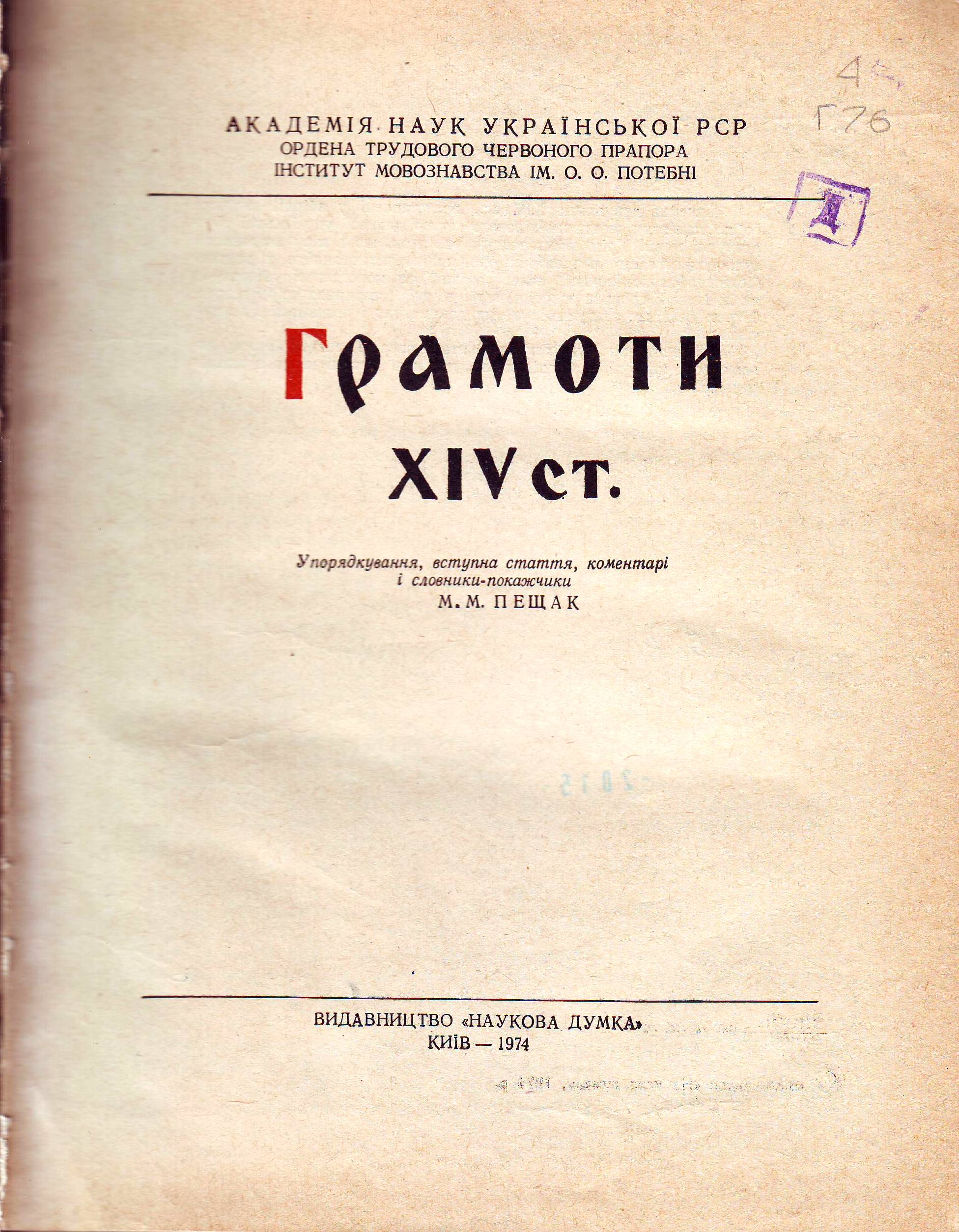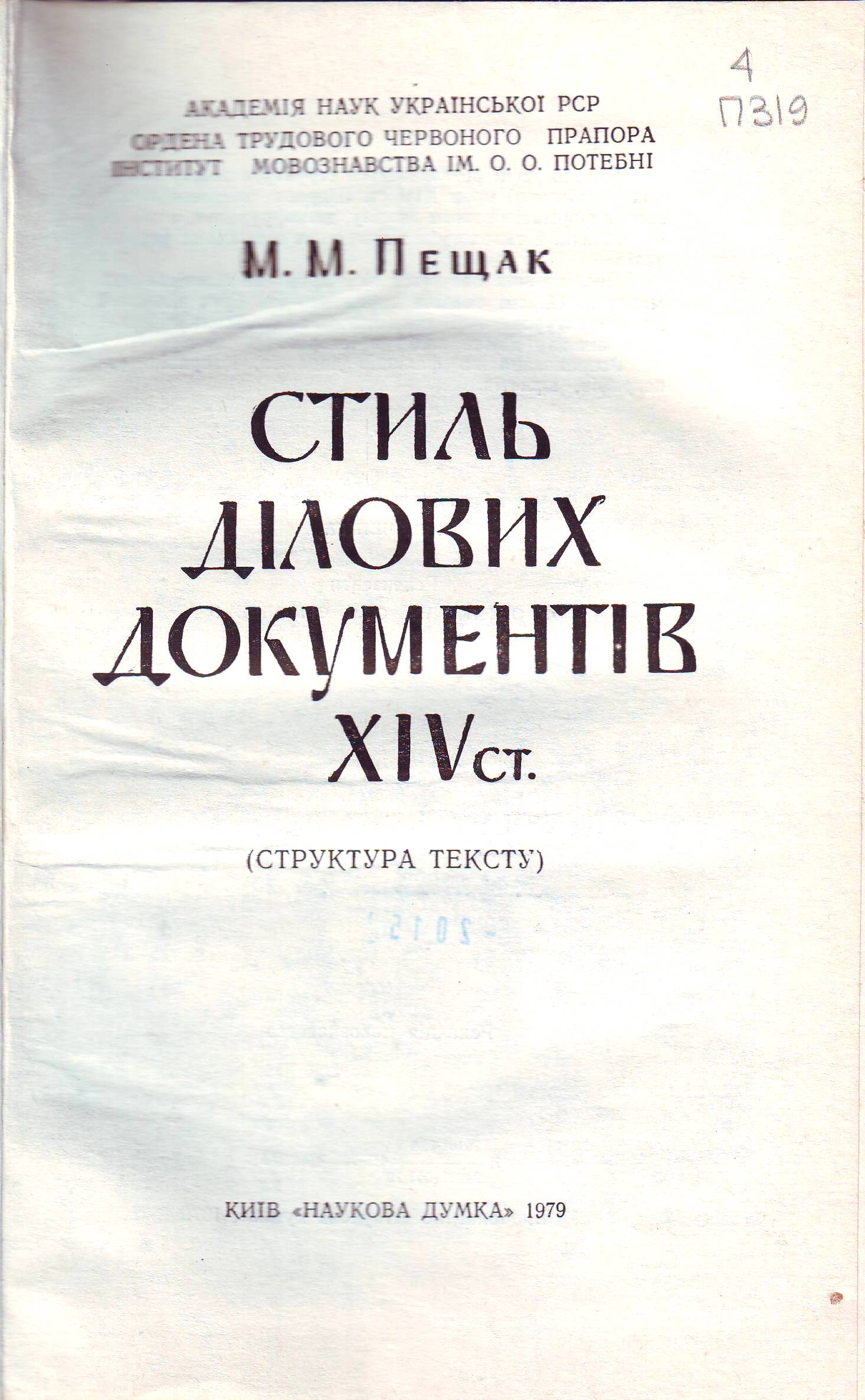 Пещак М. М. Стиль ділових документів ХIV ст. (структура тексту) / М. М. Пещак ; відп. ред. І. П. Чепіга ; Ін-т мовознавства ім. О. О. Потебні АН УРСР . – Київ : Наукова думка, 1979 . – 268 с. У книзі розглядається структура тексту памяток української мови XIV ст. Широко застосовуються засоби формалізованого аналізу, дешифрування, а також статистичні й типологічні зіставлення одержаних результатів. |