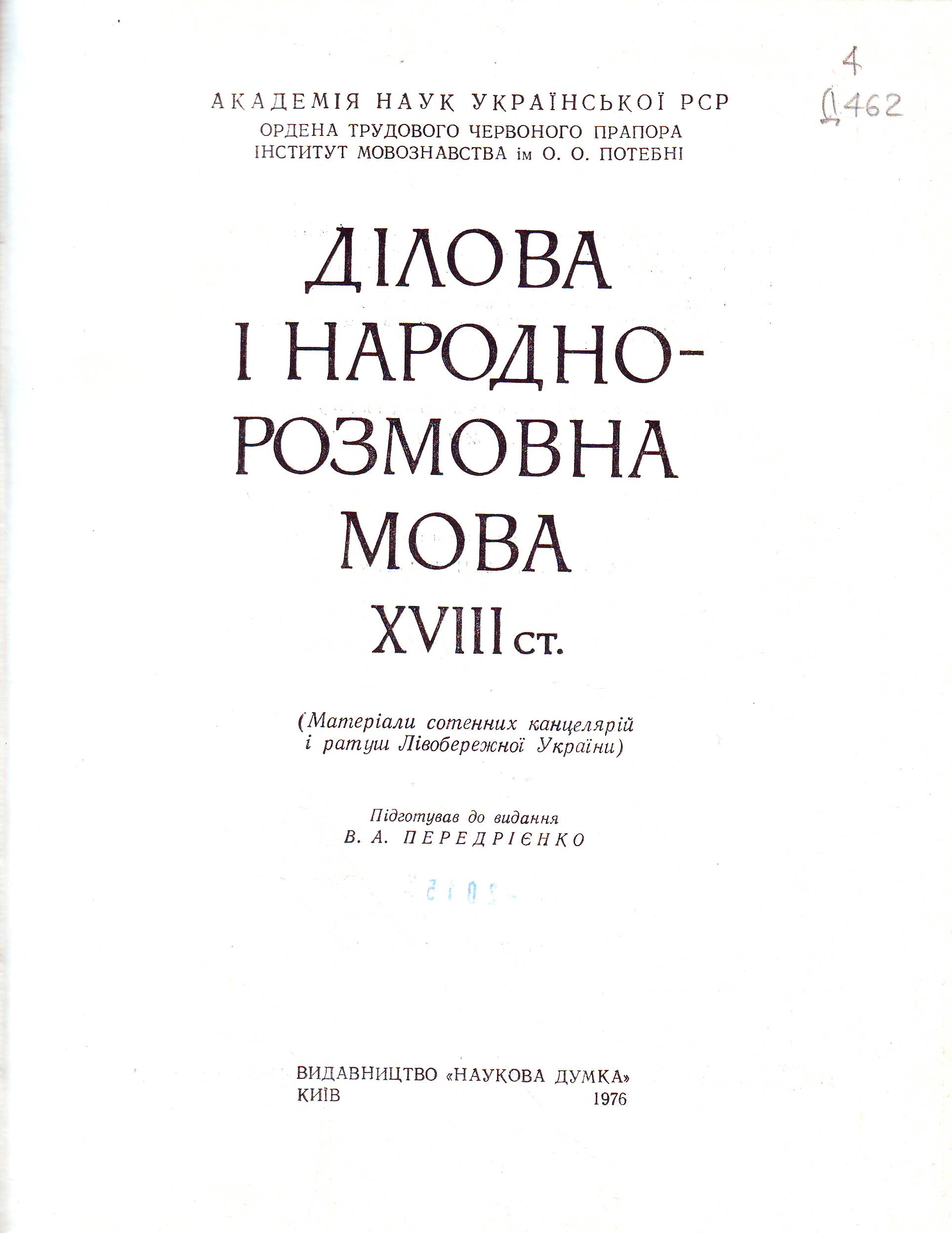 Ділова і народно-розмовна мова XVIII ст. Матеріали сотенних канцелярій і ратуш Лівобережної України / підгот., передмова В. А. Передрієнко ; Інститут мовознавства ім. О. О. Потебні АН УРСР . – Київ : Наукова думка, 1976 . – 416 с. : іл. – (Пам'ятки української мови : cерія актових документів і грамот) До збірки входять акти сотенних канцелярій і ратуш Лівобережної України XVIII ст., Вони охоплюють сфери суспільно-політичного життя народу, правових відносин, днржавного управління, суду тощо. Вони яскраво ілюструють процес формування української літературної мови на народній основі. |