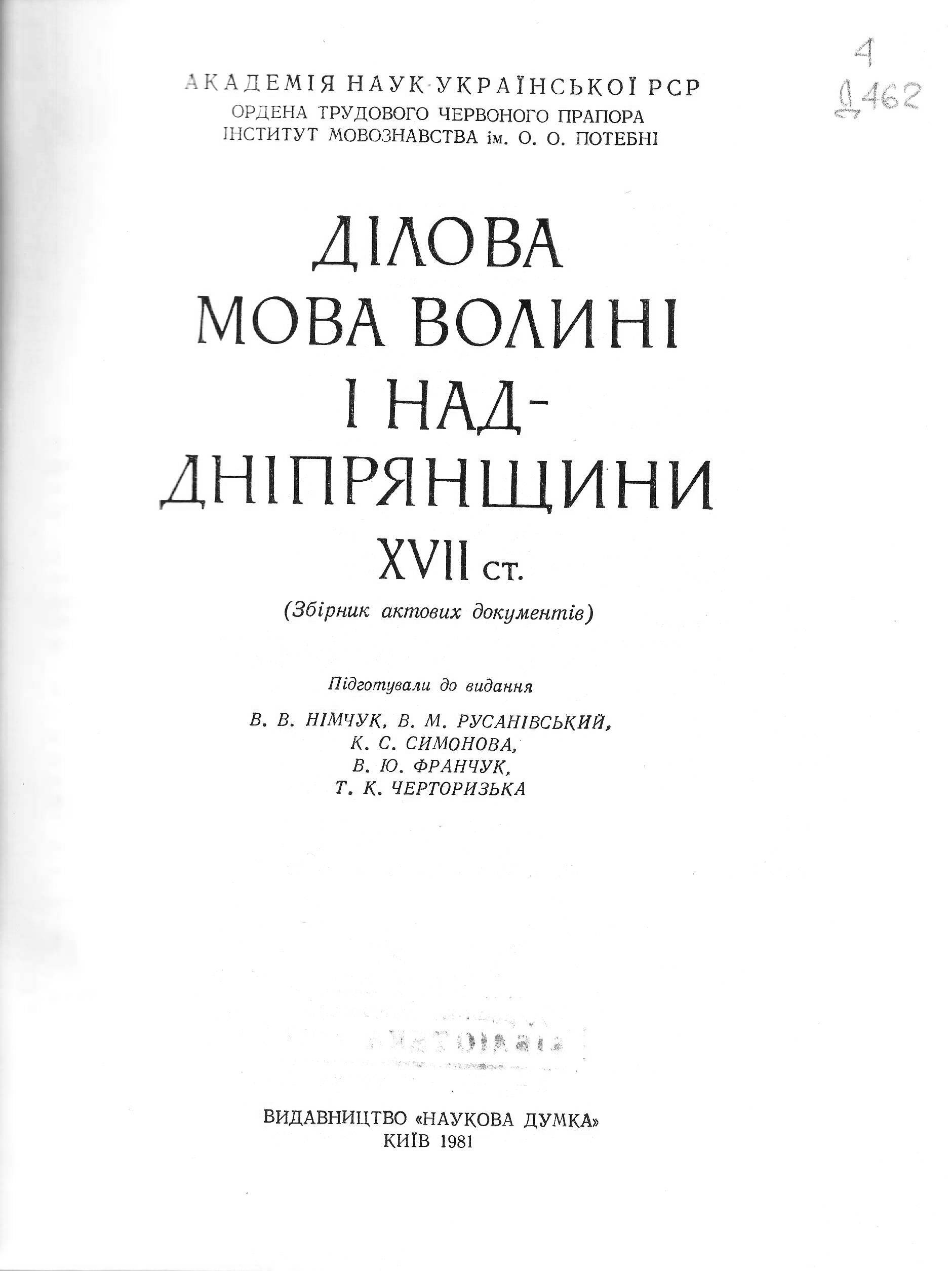 Ділова мова Волині і Наддніпрянщини XVII ст. : збірник актових документів / підгот. Василь Васильович Німчук, Віталій Макарович Русанівський, інш. ; Інститут мовознавства ім. О. О. Потебні АН УРСР . – Київ : Наукова думка, 1981 . – 316 с. – (Пам'ятки української мови серія актових документів і грамот) Збірник містить тексти з трьох актових книг Житомирського гродського уряду 1605, 1609, 1649-1650 рр. і Підкоморської книги Київського воєводства 1643 p., що охоплюють різні сфери суспільно-політичного, соціально-економічного життя українського народу, правових і ділових відносин, суду, дають багатий матеріал для дослідників української мови і фахівців, що вивчають історію українського народу, його культуру. До видання додаються вступна стаття, покажчики тононімів, антропоніміє і словник маловідомих слів. |