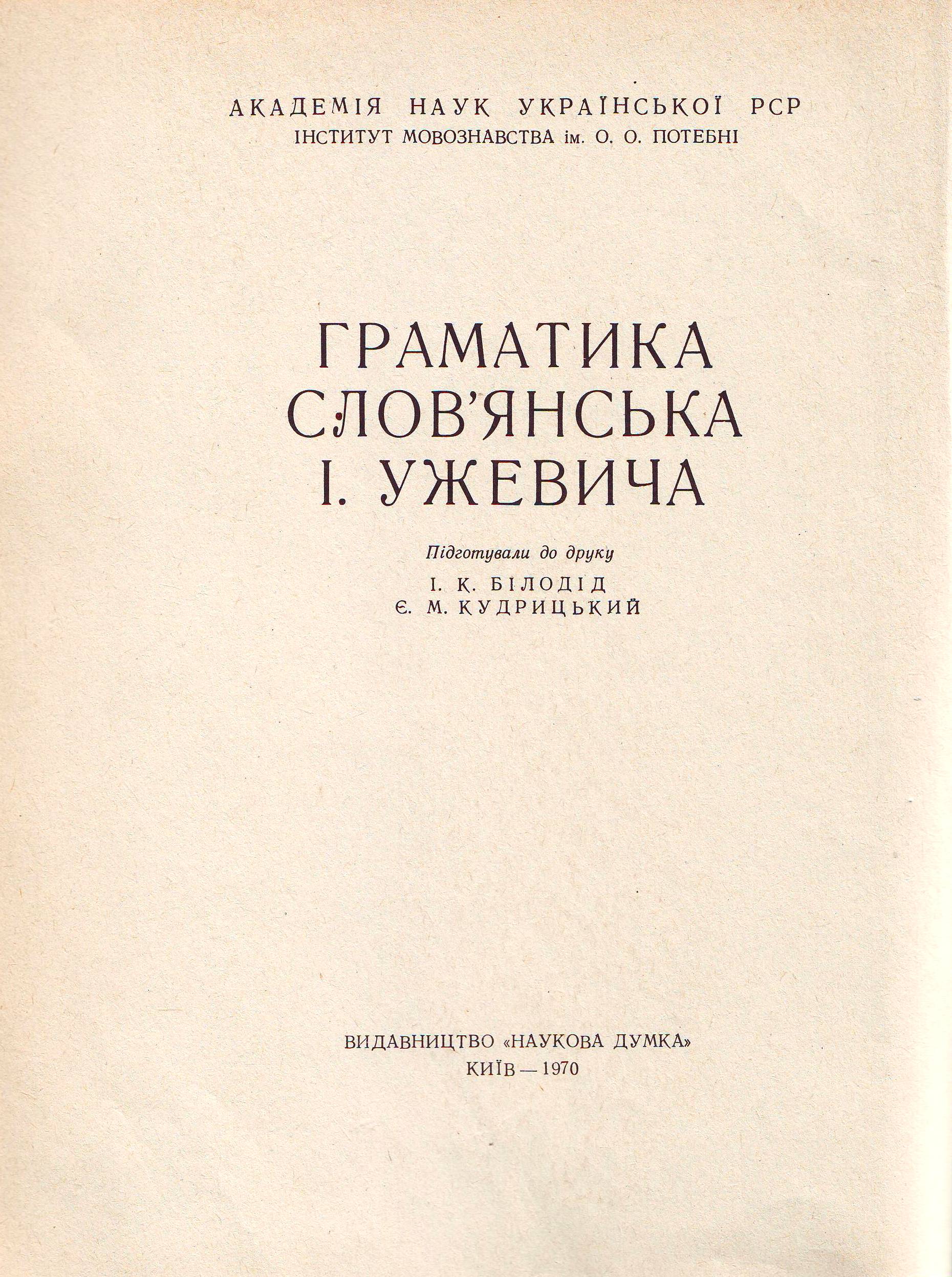 Граматика слов’янська І. Ужевича / підгот. до друку І. К. Білодід, Є. М. Кудрицький ; Інститут мовознавства ім. О. О. Потебні АН УРСР. — К.: Наукова думка, 1965. — 164 с. – (Пам'ятки української мови XVII ст.). Винятковою працею в історії староукраїнської філології є «Граматика словенская». Рукопис пам’ятки з датою 1643 р. зберігається в Національній бібліотеці в Парижі. Другий варіант твору, датований 1645 р., знаходиться в бібліотеці м. Арраса на півночі Франції. Обидва манускрипти написані латинською мовою. Вони опубліковані фотомеханічним способом із перекладом українською мовою паризького варіанта книги І. Ужевича, здійсненим Є. М. Кудрицьким. І. Ужевич добре знав, що це перша праця такого змісту, тому після розгляду граматичної системи наприкінці її в «Епіграмі на книгу» слушно писав: «Книго, ніколи такою на батьківщині не бачена...». |