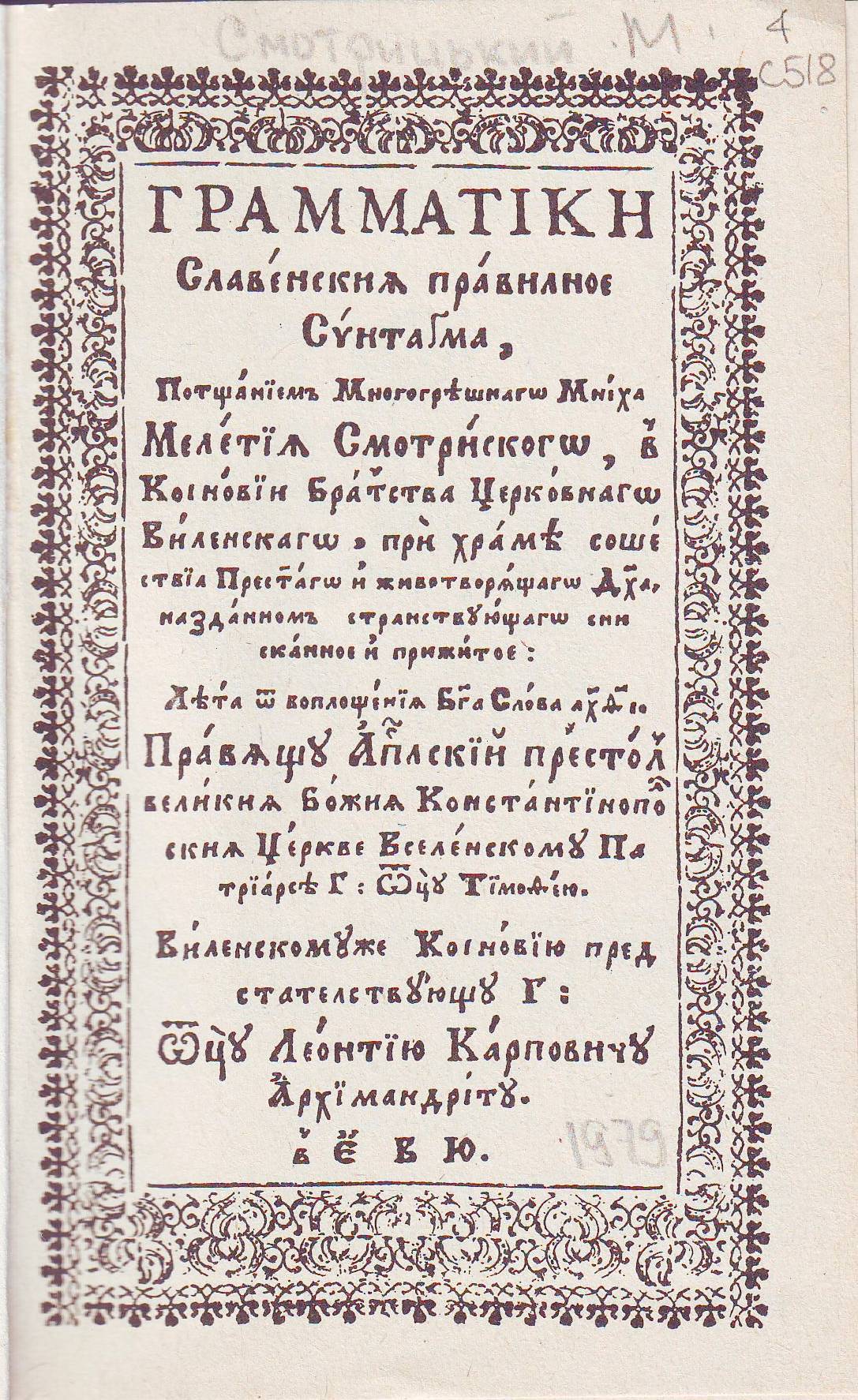 Смотрицький М. Граматики славенскія правилное синтагма / М. Смотрицький; підгот. до вип. В. Німчук; відп. ред. В. Русанівський. – Факсимільне вид. 1619 р. – Київ : Наукова думка, 1979. «Граматика слов’янська» Мелентія Смотрицького, що вперше вийшла у світ 1619 року. Це факсимільне видання «Граматики...». Орфографічні правила, вміщені тут, відповідали нормам живої мови. Вони використовувалися в церковній сфері в більшості слов’янських народів. До середини XVIII ст. ця книга була єдиним підручником граматики, її правилами послуговувалося й світське письменство, а в Закарпатті та в деяких інших регіонах України ними користувалися аж до середини XIX ст. |