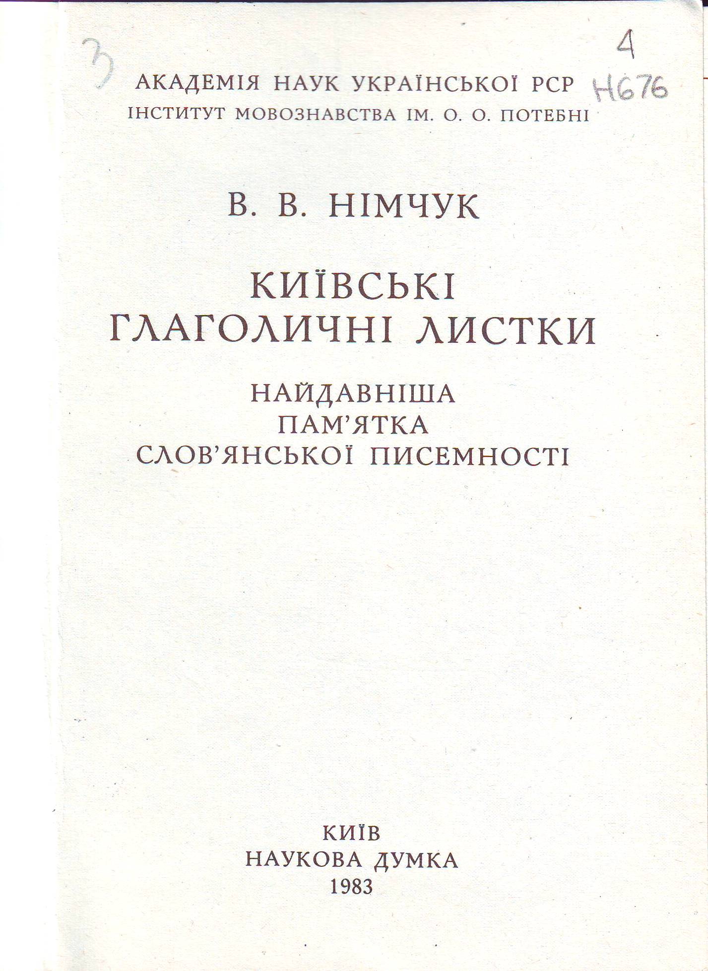 Німчук В. В. Київські глаголичні листки: найдавніша пам'ятка слов'янської писемності / В. В. Німчук ; Ін-т мовознавства ім. О. О. Потебні АН УРСР. – Київ : Наукова думка, 1983 . – 140 с. Київські глаголичні листки — одна з найдавніших старослов'янських писемних пам'яток, що відносяться більшістю лінгвістів до X ст. Текст пам'ятки написаний глаголицею. Пам'ятка зберігається в НБУВ ім. В. Вернадського. Василь Німчук дослідив і опублікував цей документ всеслов’янського значення. |