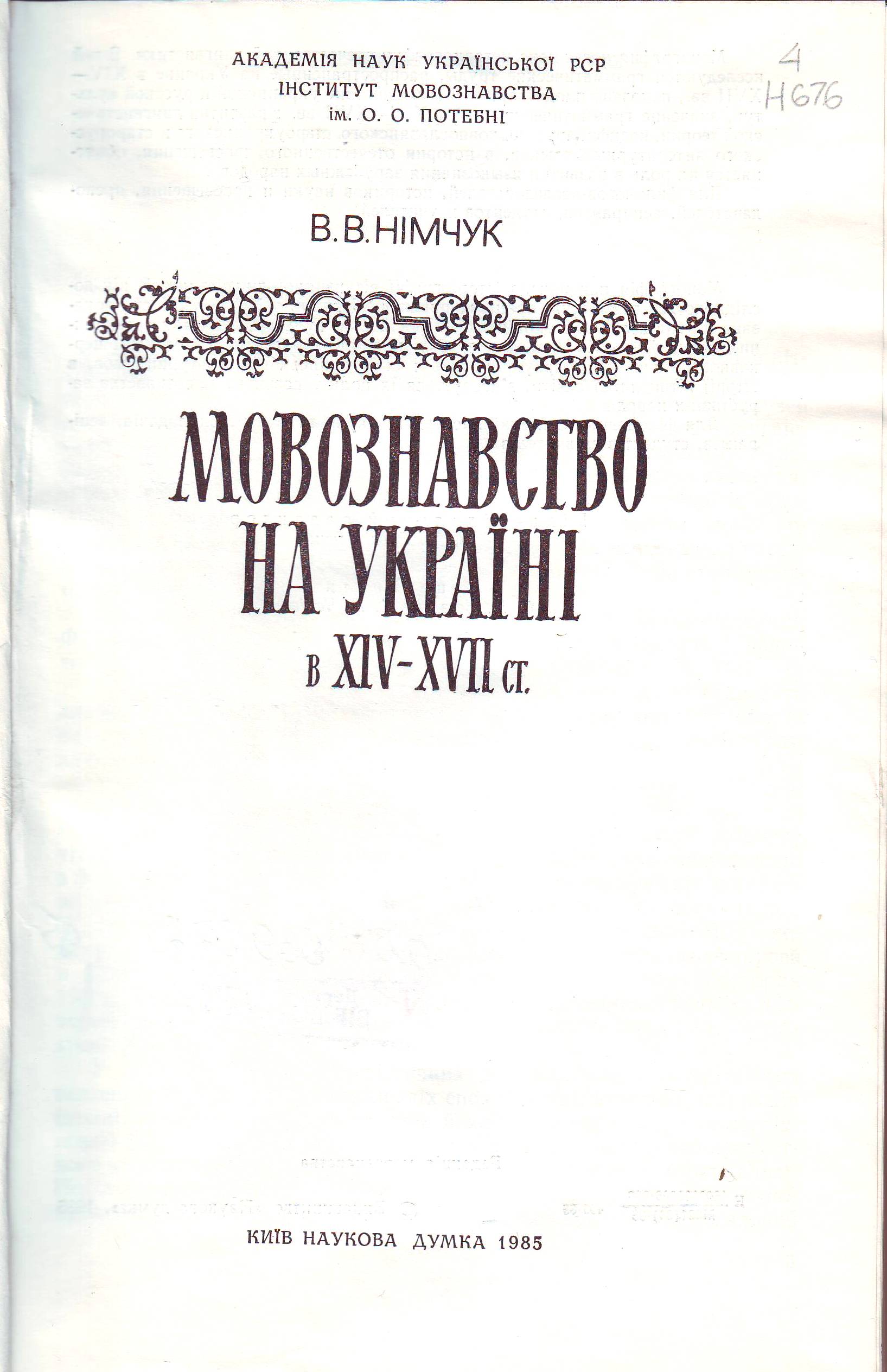 Німчук В. Мовознавство на Україні в XIV—XVII ст. / В. Німчук ; Ін-т мовознавства ім. О. О. Потебні АН УРСР. — Київ: «Наукова думка», 1985. – 222 с. Монографія присвячена історіографії вітчизняної лінгвістики. В ній досліджуються граматичні праці, поширені на Україні у XIV-XVII ст., показана плідна взаємодія української й російської культур, значення граматичних праць XIV-XVII ст. в розвитку лінгвістичної теорії, кодифікації церковнослов’янської, староукраїнської і староросійської літературних мов, в історії вітчизняної освіти, з’ясовується їх роль у розвитку мовознавства зарубіжних народів. |