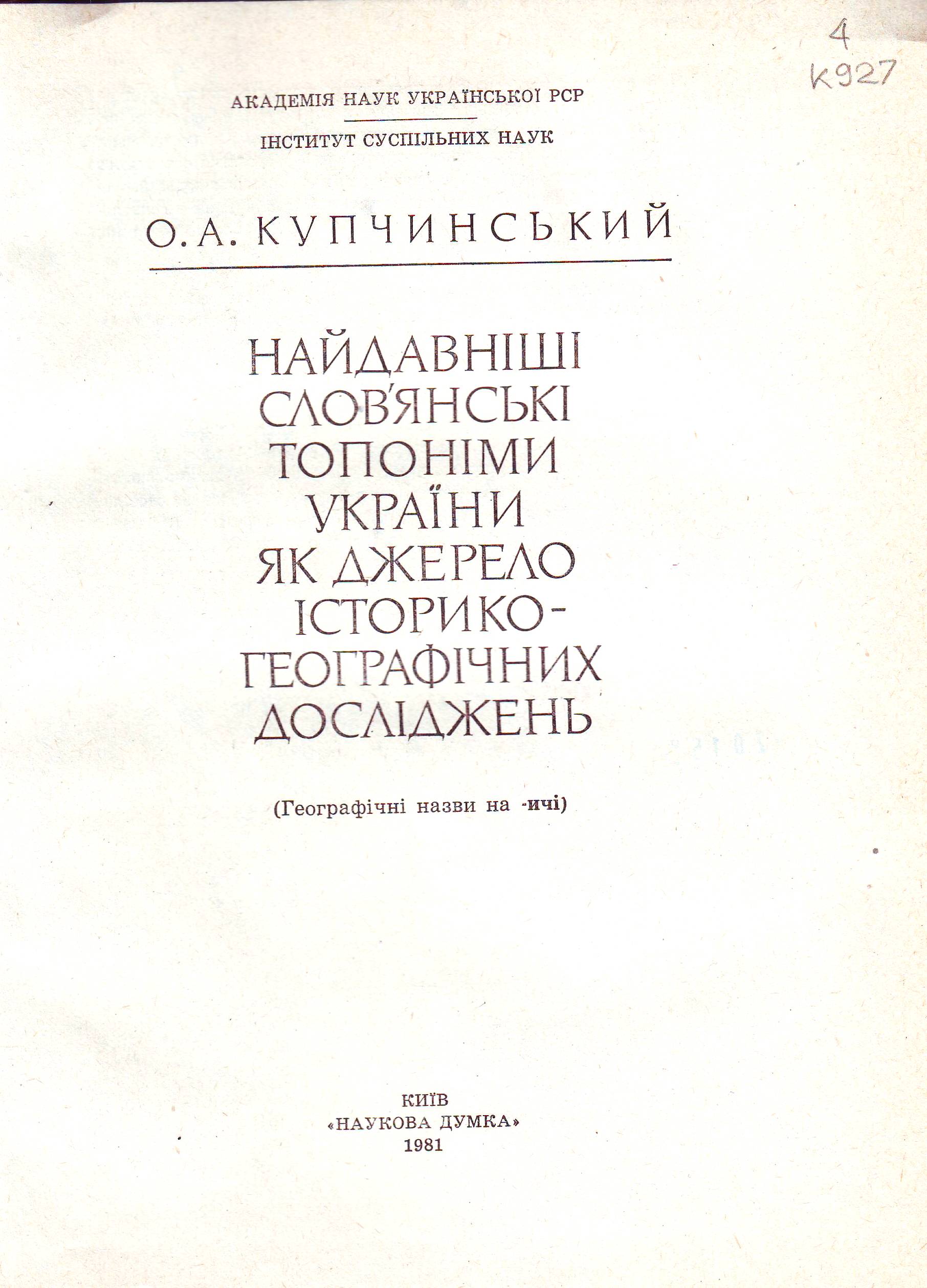 Купчинський О. А. Найдавніші слов’янські топоніми України як джерело історико-географічних досліджень: географічні назви на ’-ичі’ / О. Купчинський ; АН УРСР ; Ін-т сусп. наук. – К.: Наукова думка, 1981 р. – 251 с. Дослідження, здійснене автором на основі комплексного вивчення топонімічних матеріалів, висвітлює питання лінгвістики, археології, географії слов’ян. |